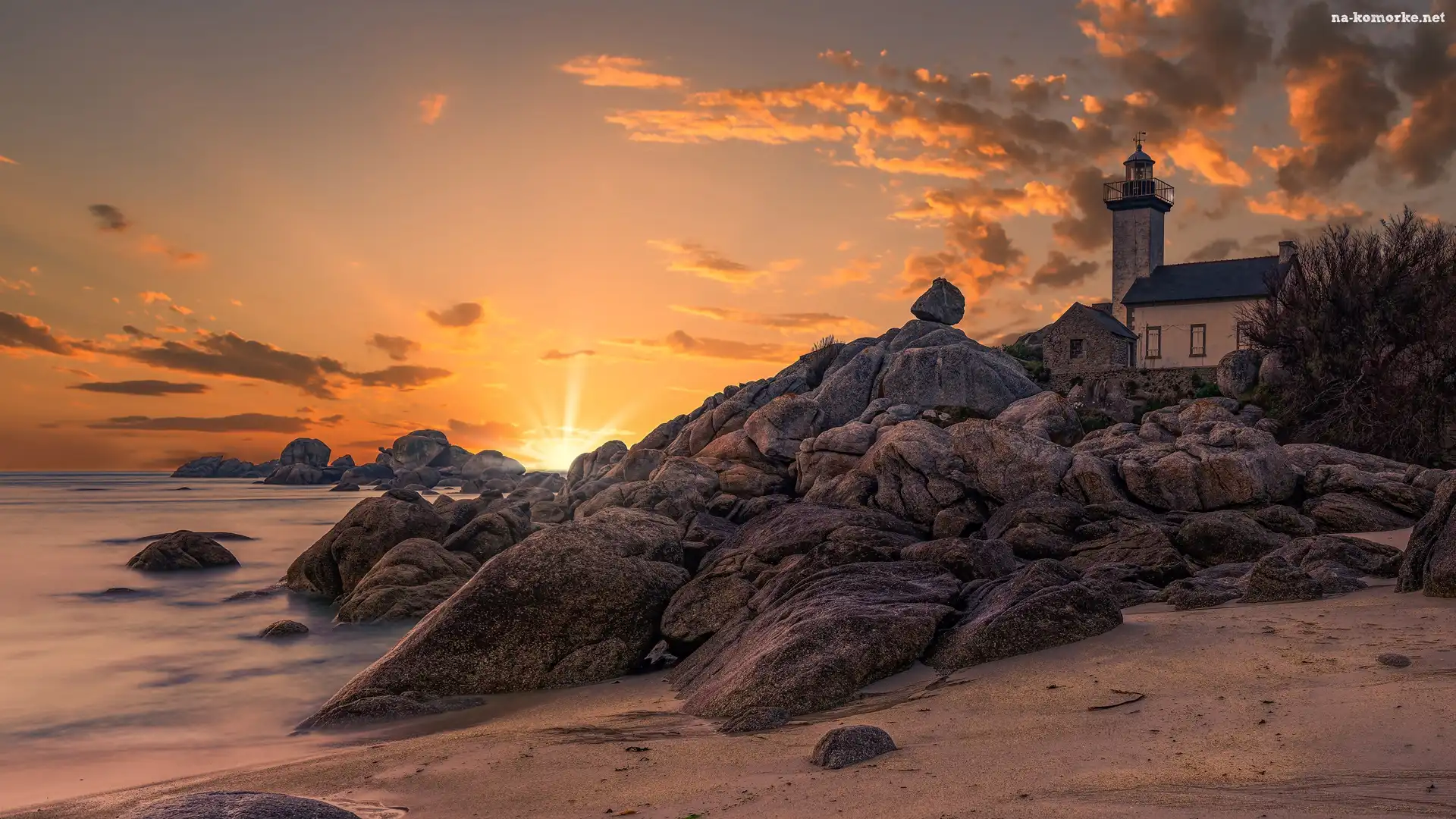 Latarnia morska, Brignogan-Plage, Francja, Phare de Pontusval, Skały, Zachód słońca, Chmury na Komórkę |