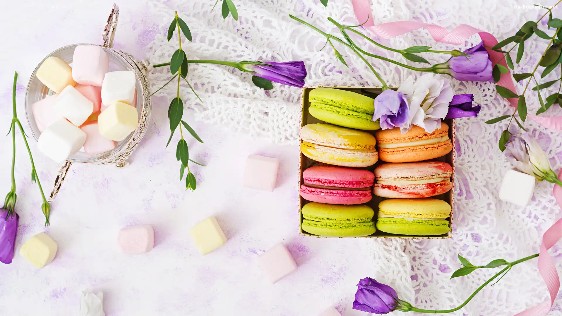 Ciasteczka, Kwiaty, Wstążka, Pianki, Kostki, Kolorowe, Makaroniki, Eustomy, Serwetka, Pianka na Komórkę |