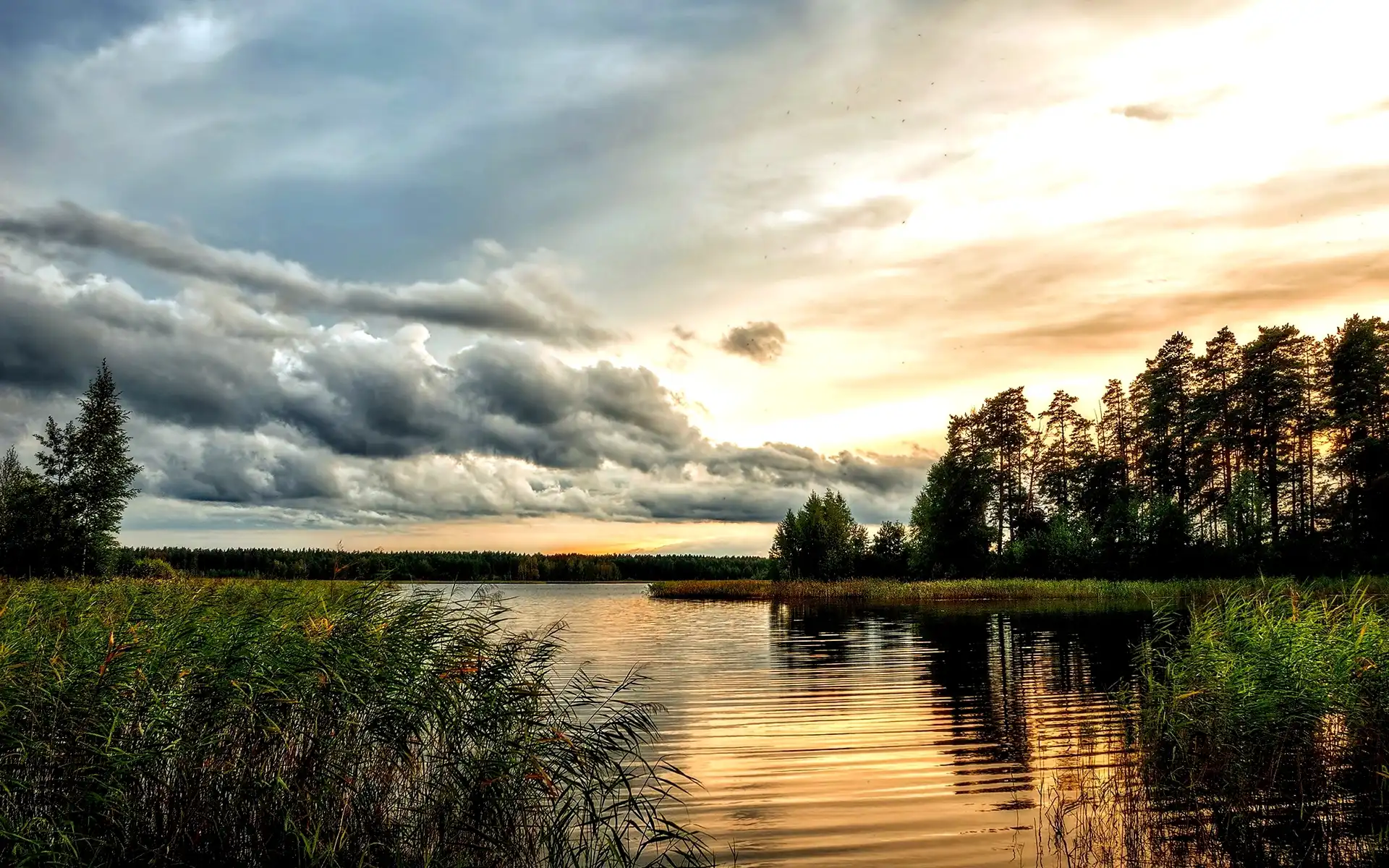 Piękne, Drzewa, Jezioro, Szuwary na Komórkę