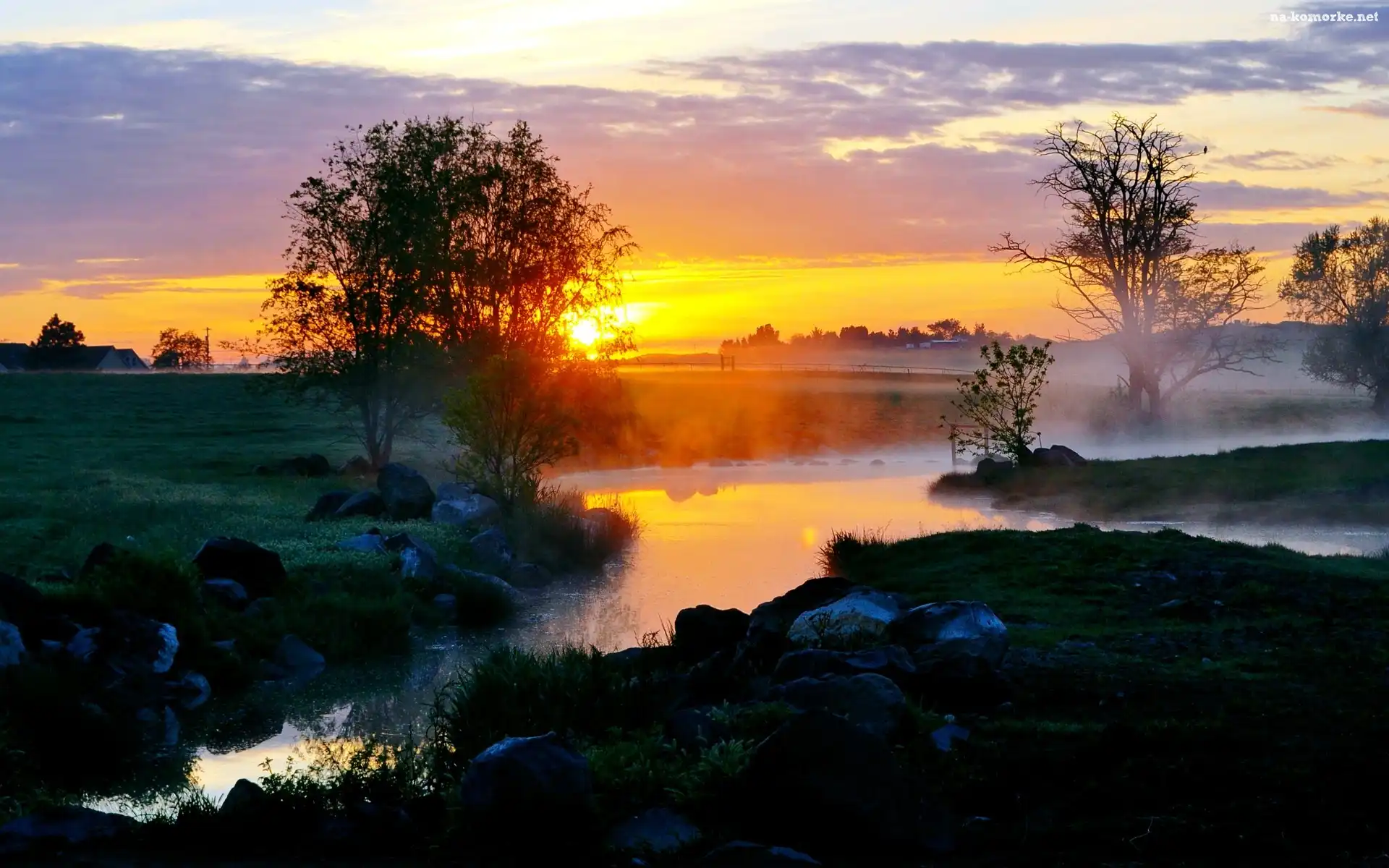 Piękny, Mgła, Rzeka, Śłońca, Drzewa, Zachód na Komórkę