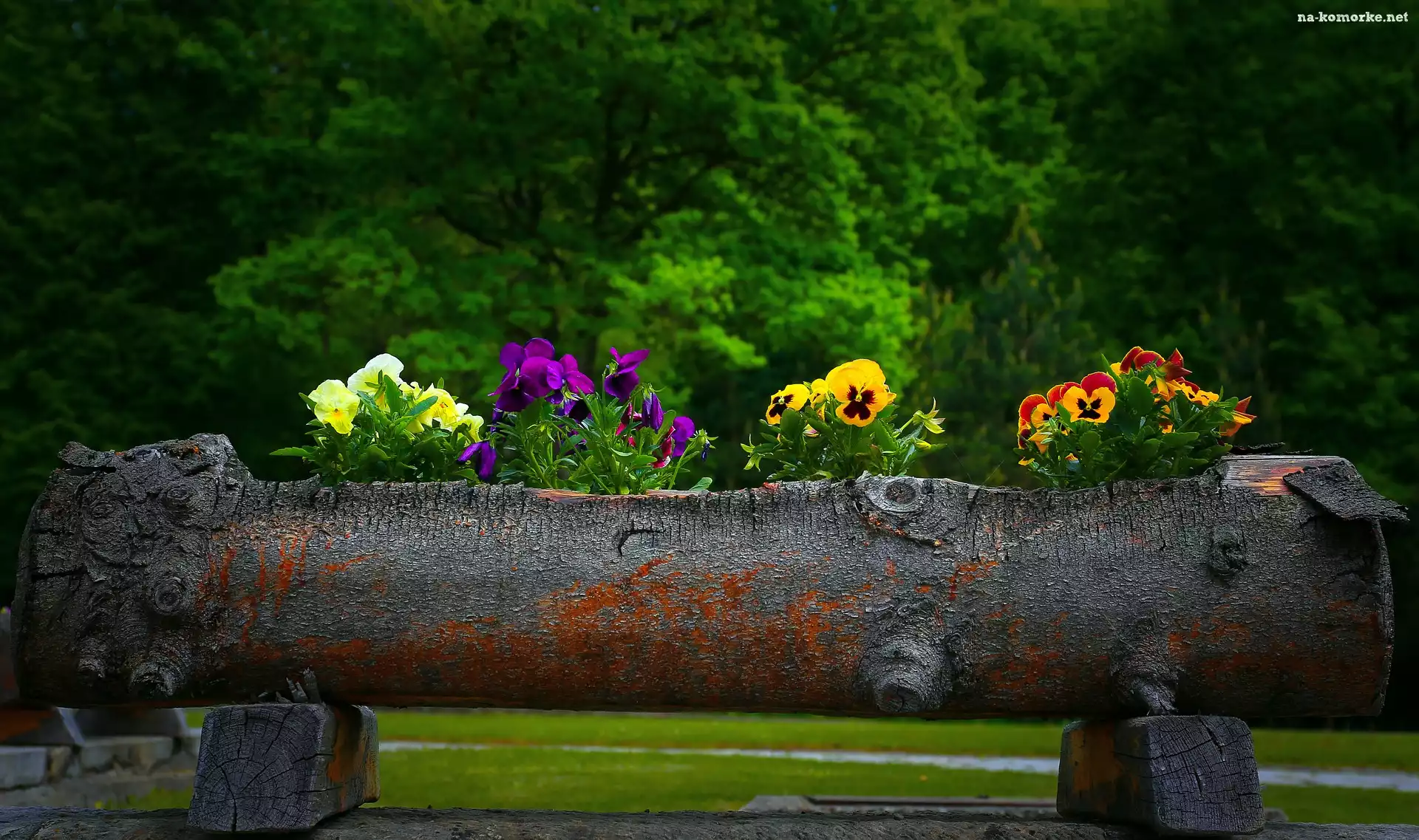 Pień, Kwiaty, Bratki, Drewniana, Donica na Komórkę