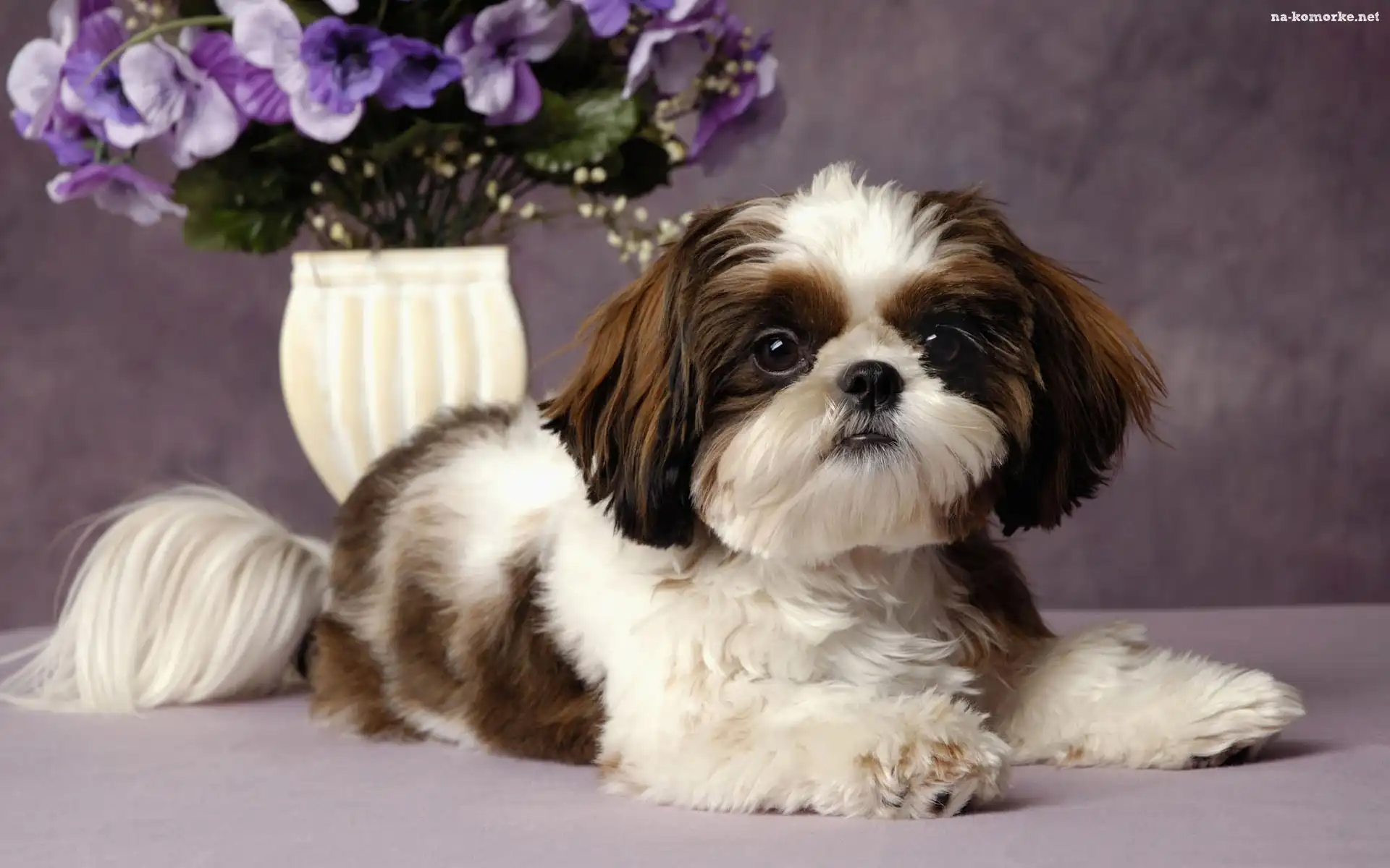 Piesek, Kwiatuszki, Spaniel Japoński, Fioletowe na Komórkę
