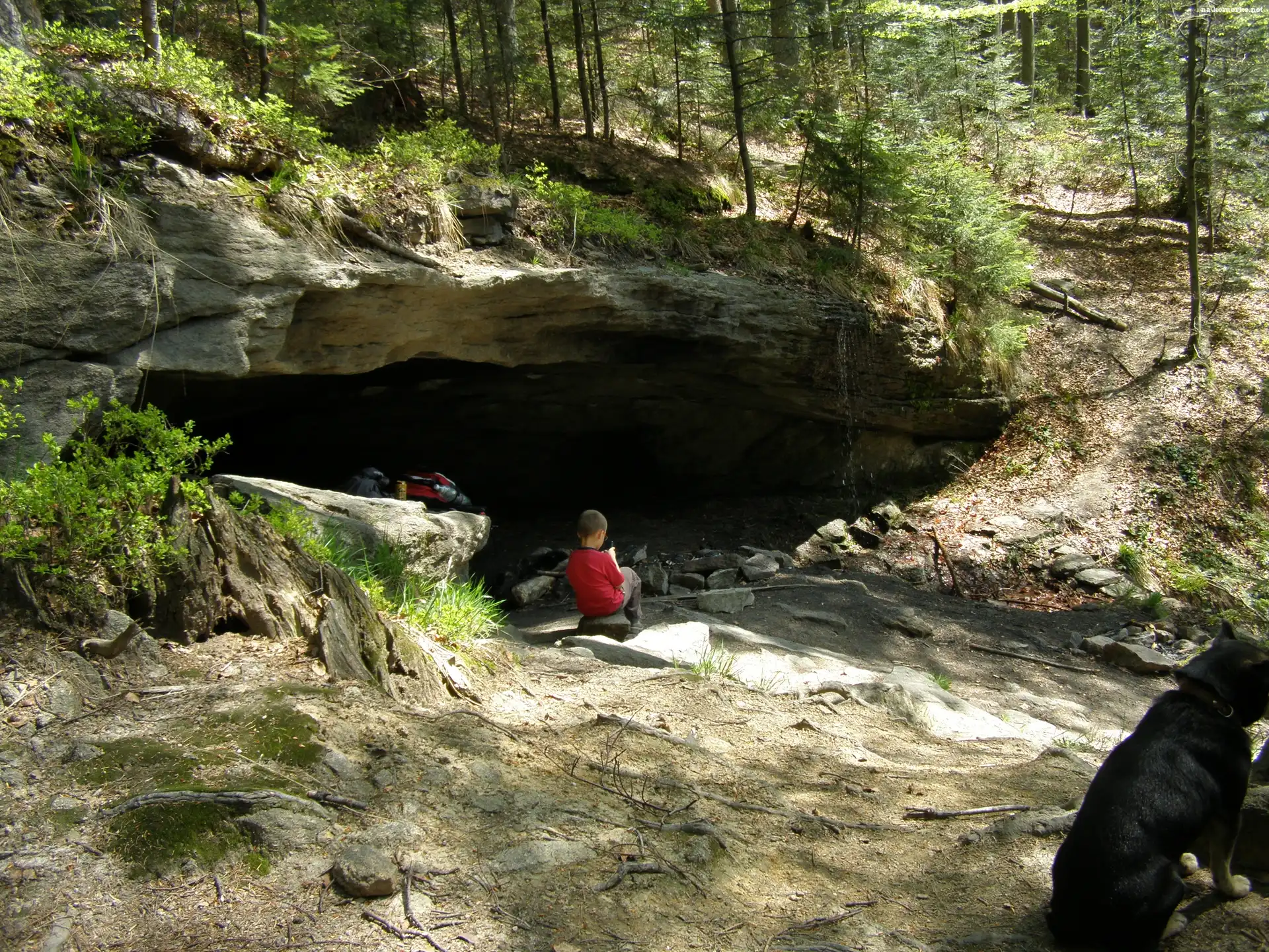 Piesek, Drzewa, Grota, Kamienie, Chłopczyk na Komórkę