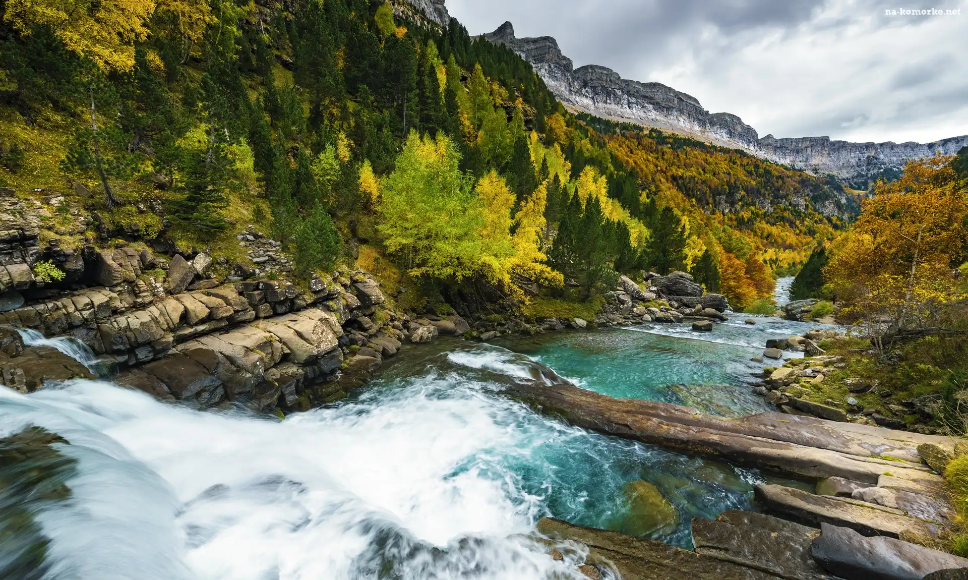 Rzeka, Jesień, Kamienie, Hiszpania, Arazas River, Drzewa, Góry, Pireneje na Komórkę