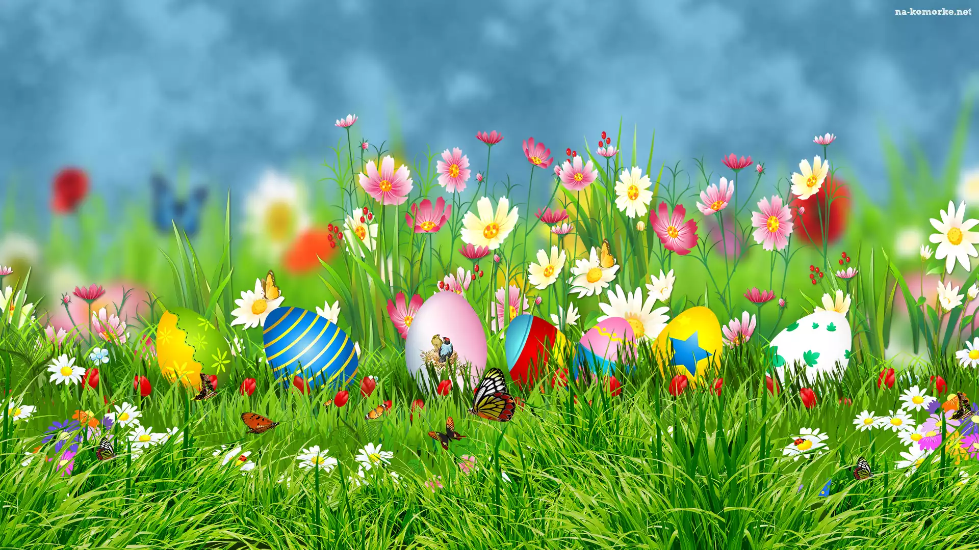 Pisanki, Kwiaty, Wiosna, Wielkanoc, Łąka, Motyle na Komórkę