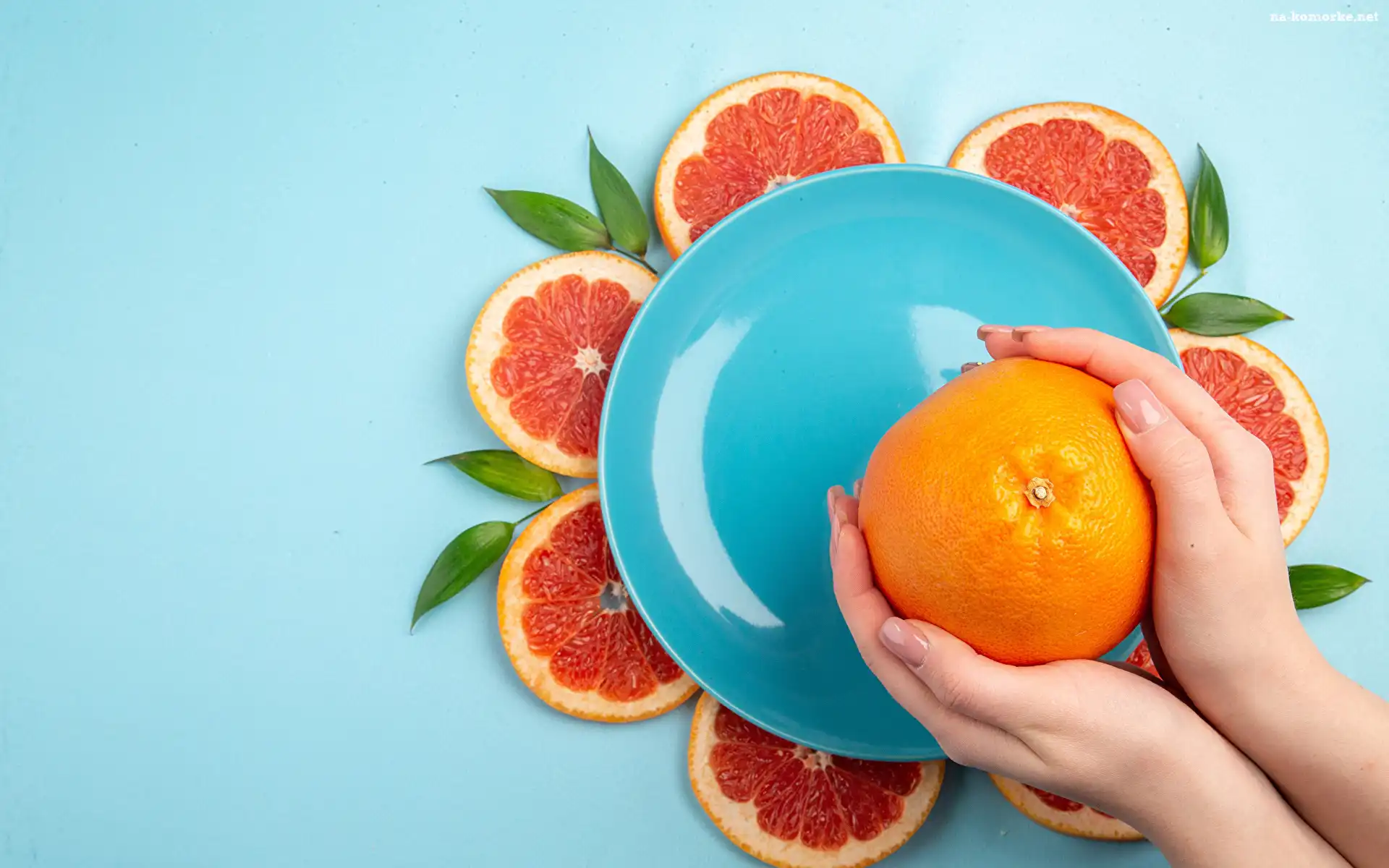 Pomarańcze, Plastry, Talerz, Listki, Dłonie na Komórkę