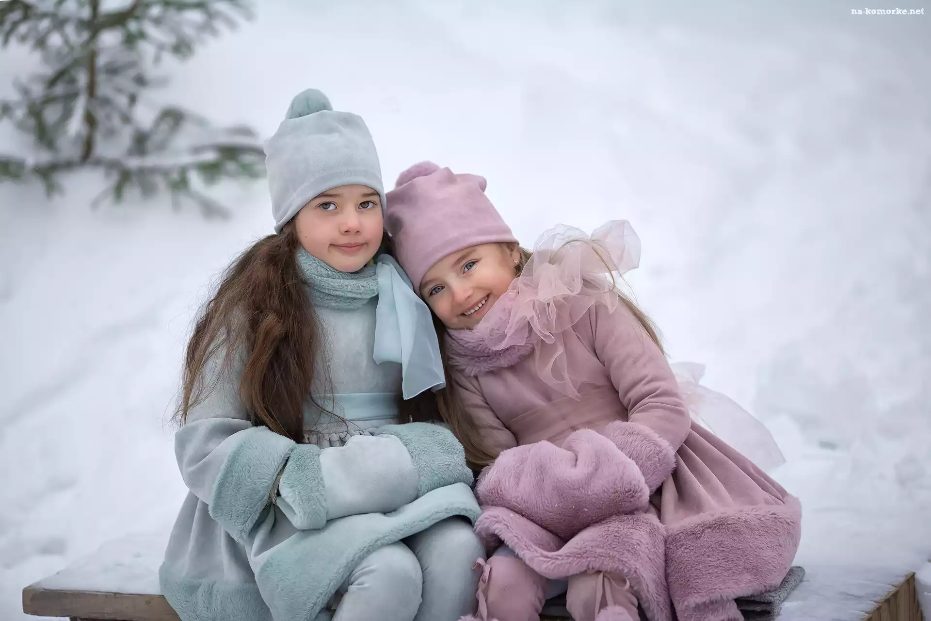Płaszczyki, Przytulone, Dwie, Zima, Dziewczynki, Czapki na Komórkę
