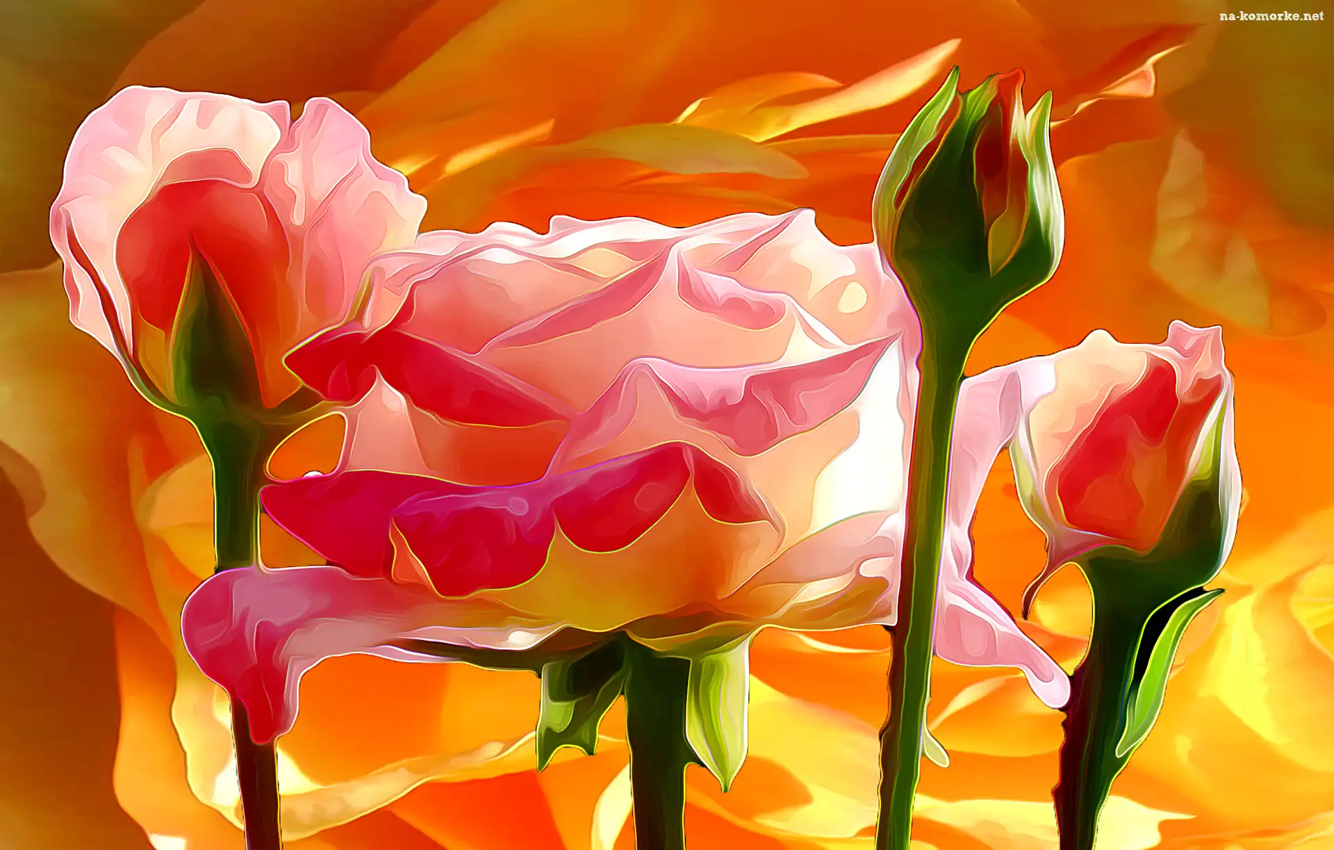 Grafika, Płatki, Kolory, Kwiaty, Róże, Pąki, Łodygi na Komórkę