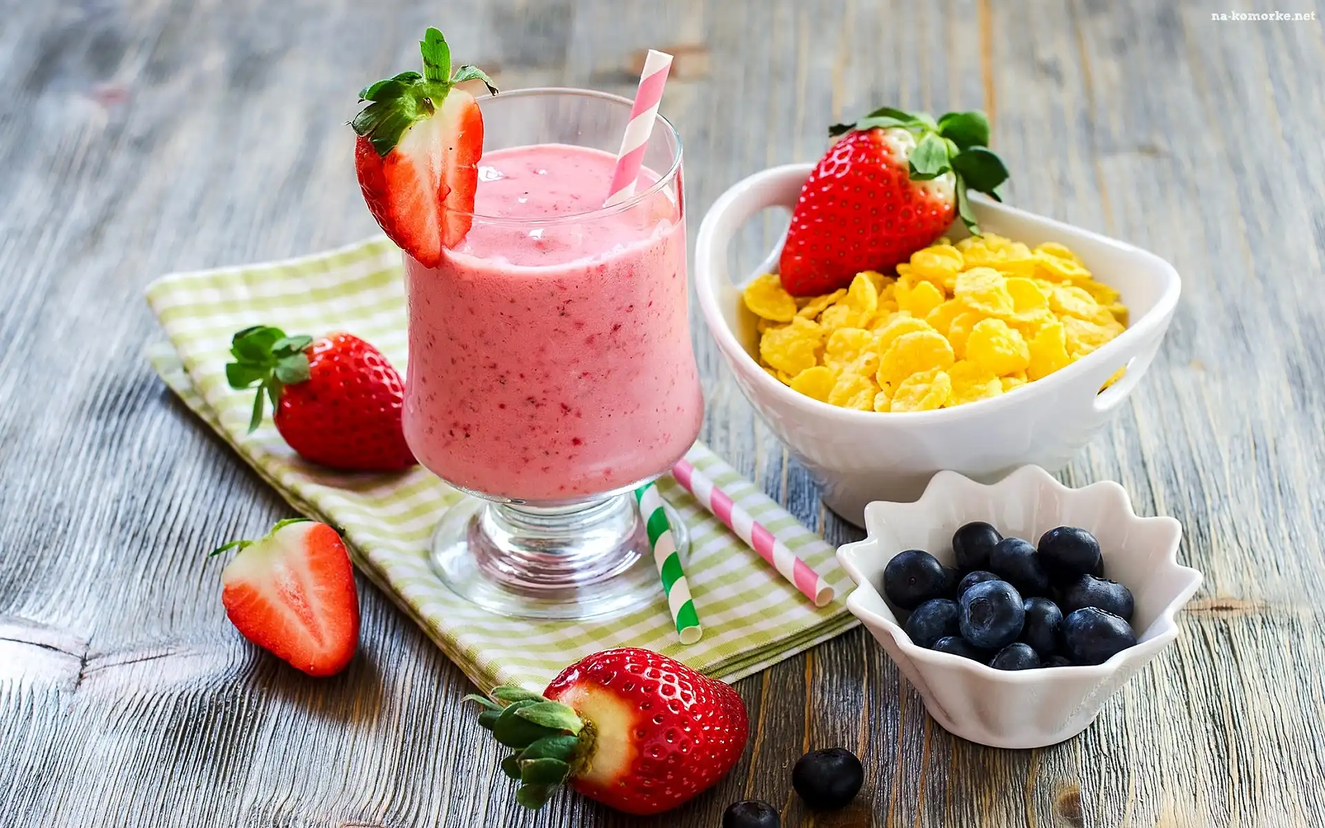 Szklanka, Koktajl, Truskawki, Słomka, Ściereczka, Truskawkowy, Kukurydziane, Jagody, Płatki na Komórkę |