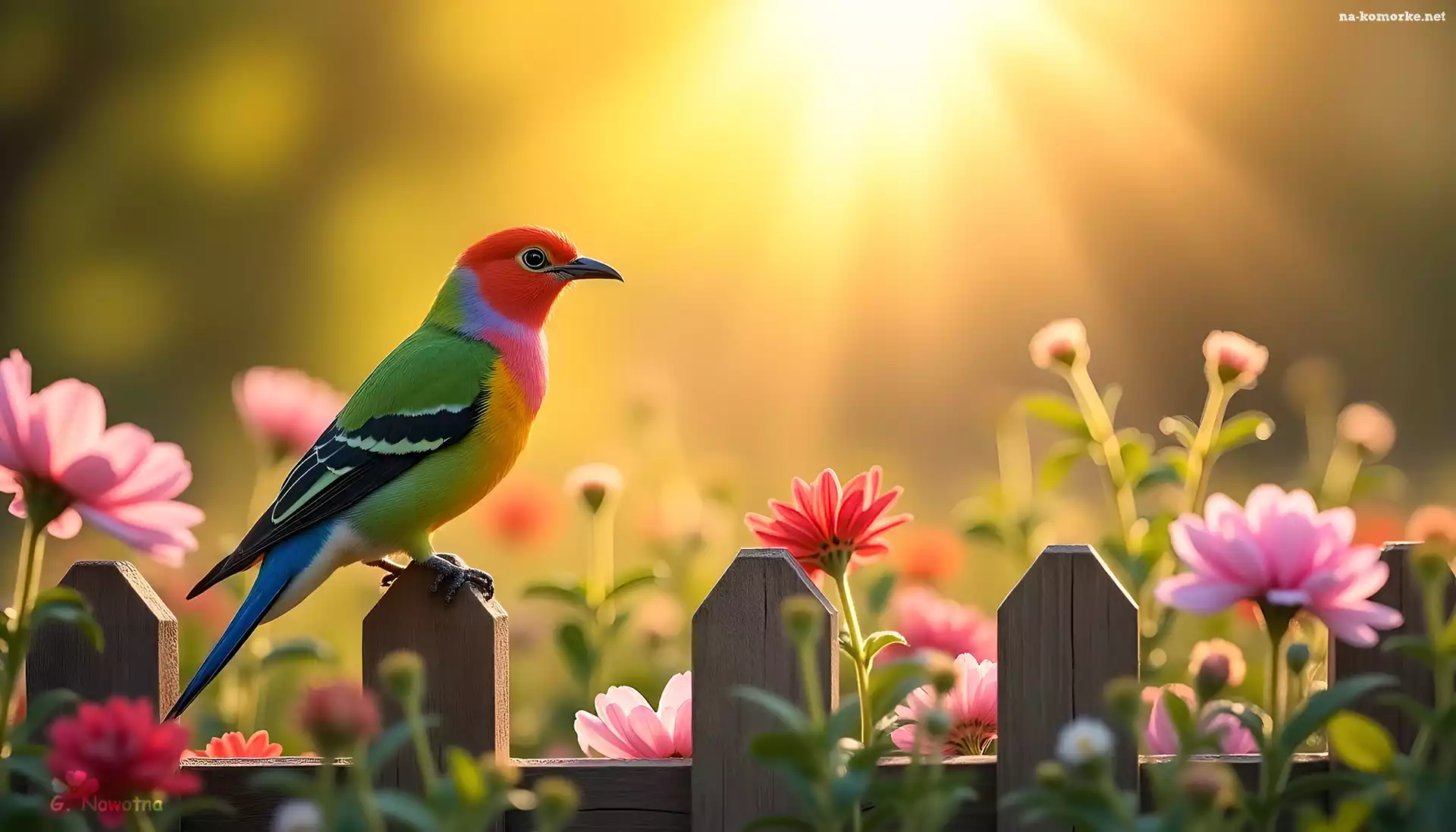 Kolorowy, Płot, Kwiaty, Ptak, Grafika na Komórkę