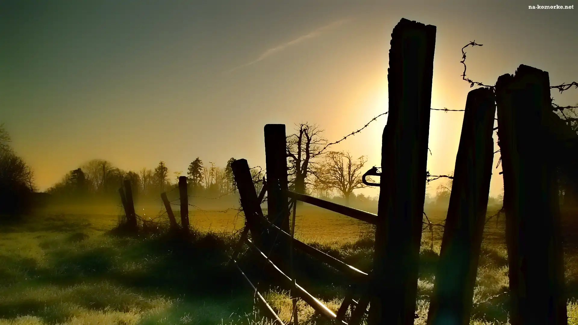 Płot, Łąka, Drzewa, Słońca, Mgła, Promienie na Komórkę