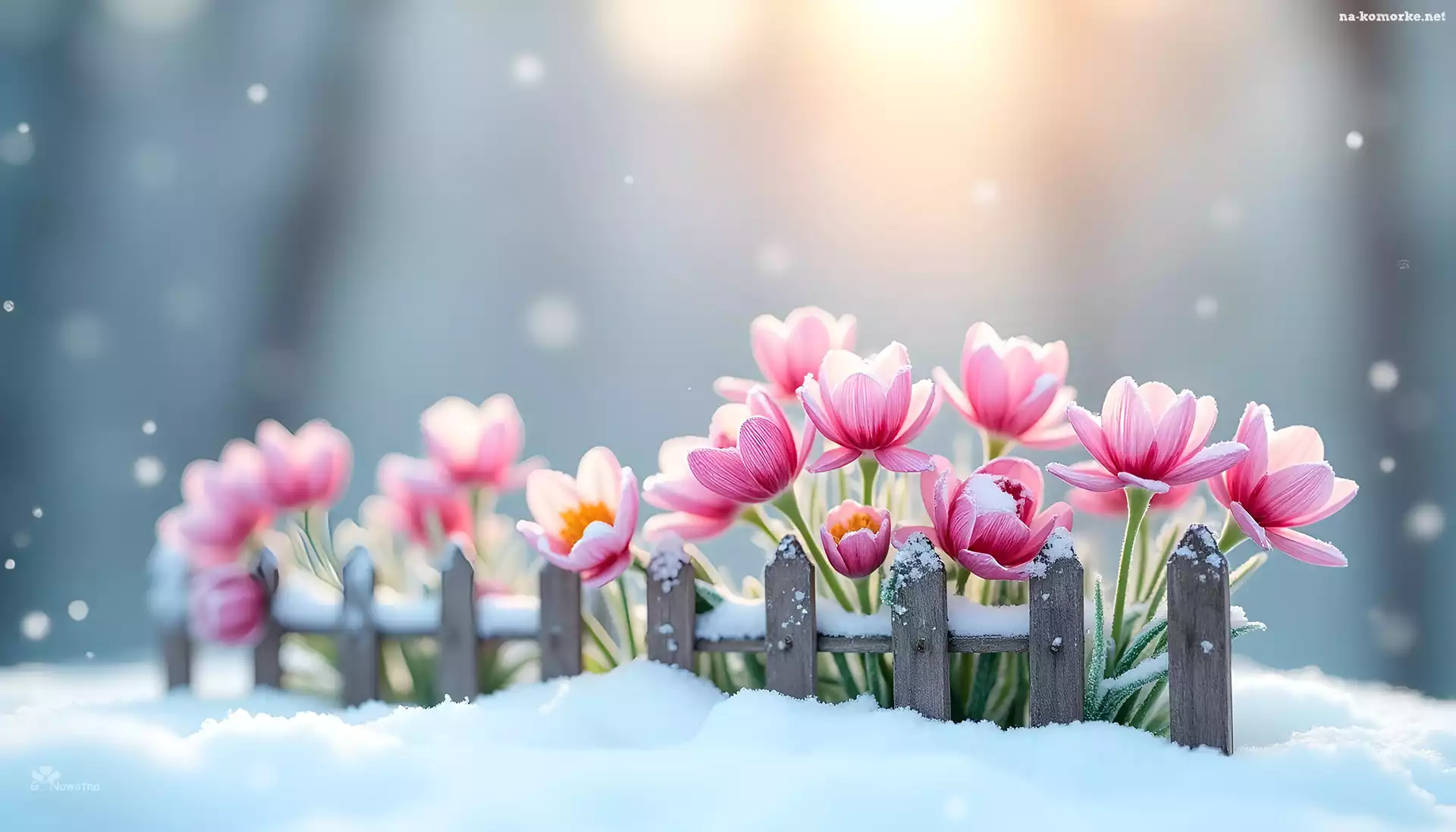 Różowe, Płotek, Śnieg, Kwiaty, Grafika na Komórkę