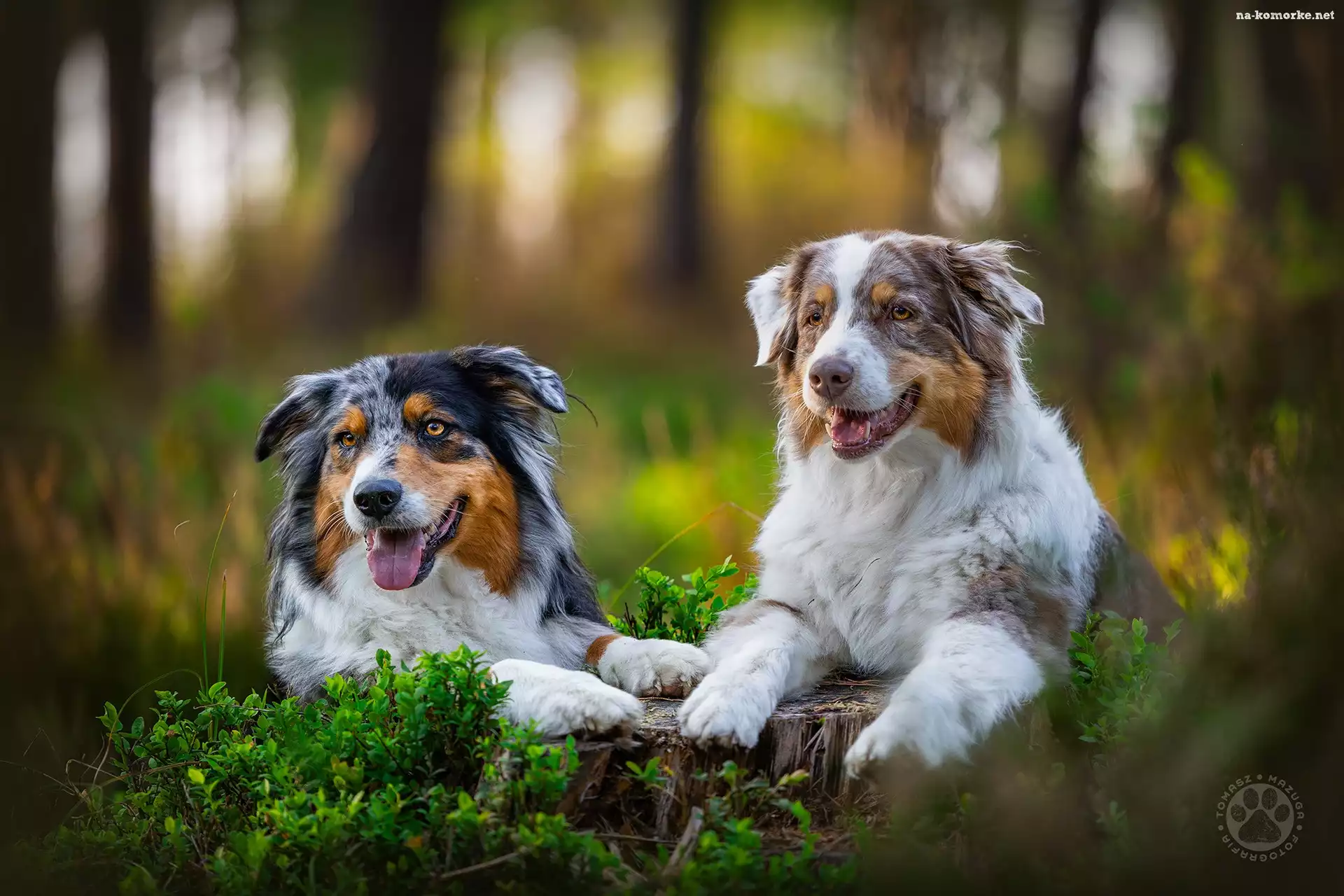 Dwa, Owczarki australijskie, Pniak, Psy, Rośliny na Komórkę