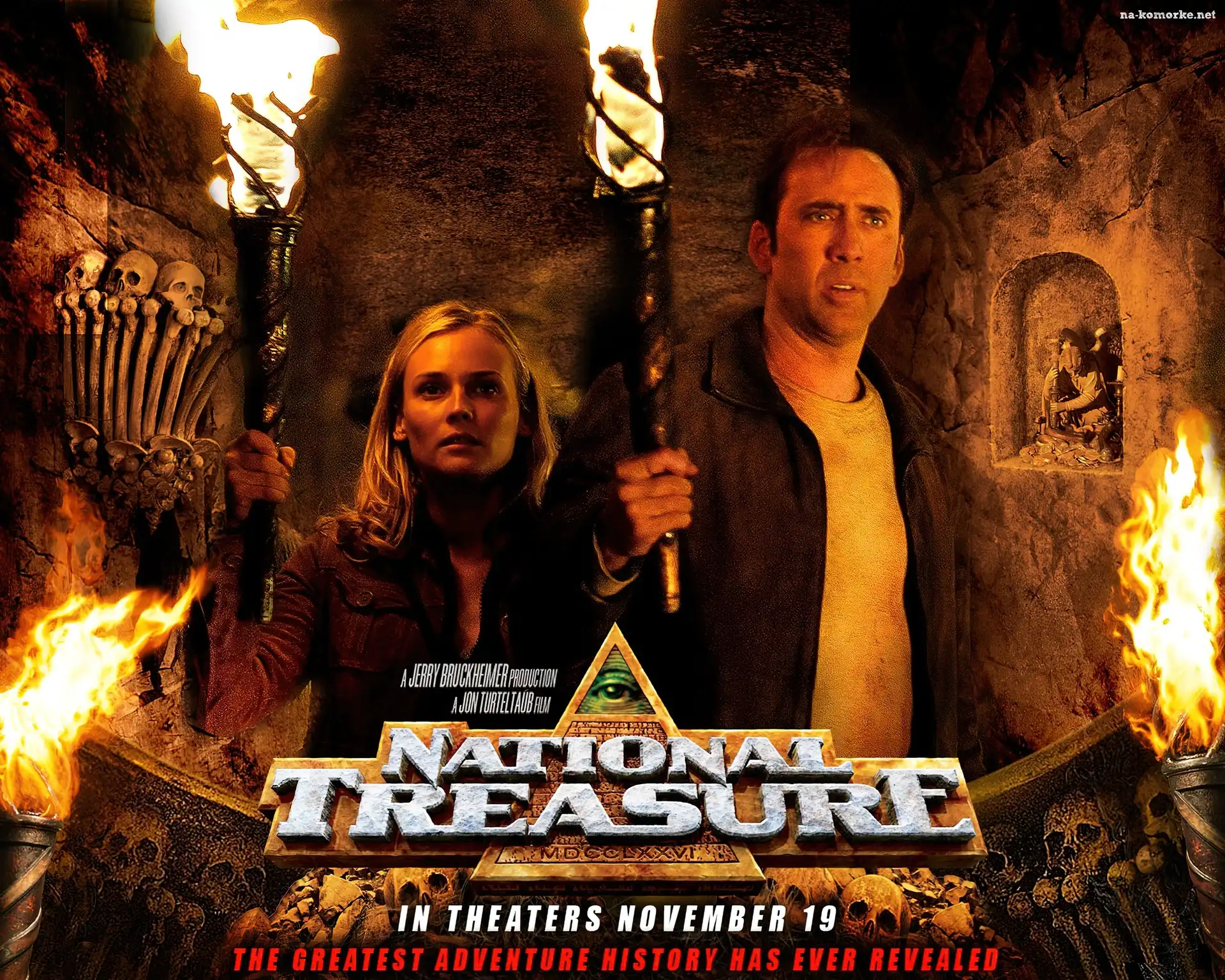 National Treasure 1, Nicolas Cage, pochodnie, Diane Kruger, podziemie na Komórkę