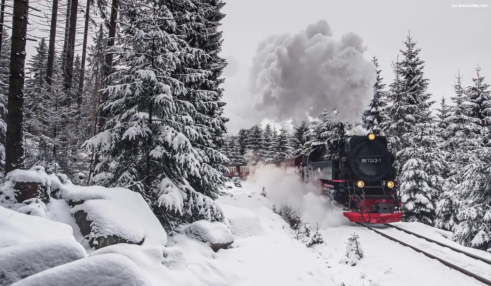 Pociąg parowy, Zima, Las, Drzewa na Komórkę