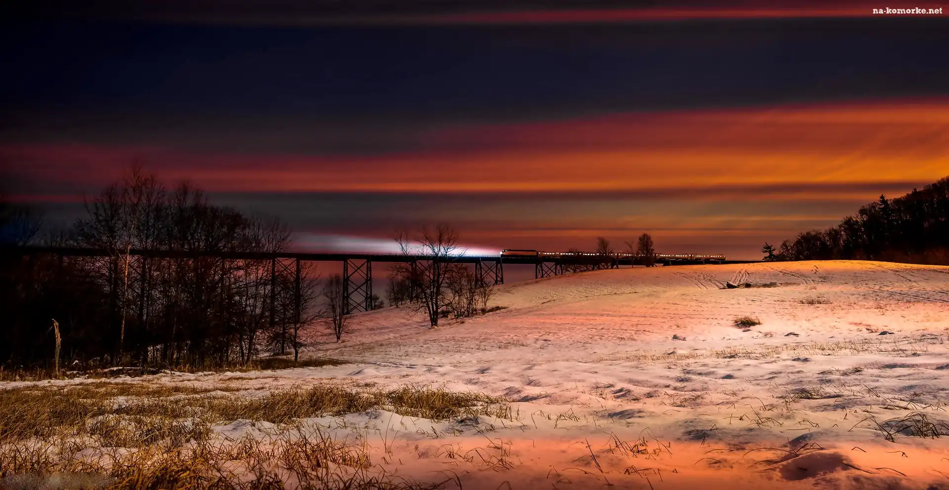 Pociąg, Noc, Zima, Drzewa, Most, Światła na Komórkę