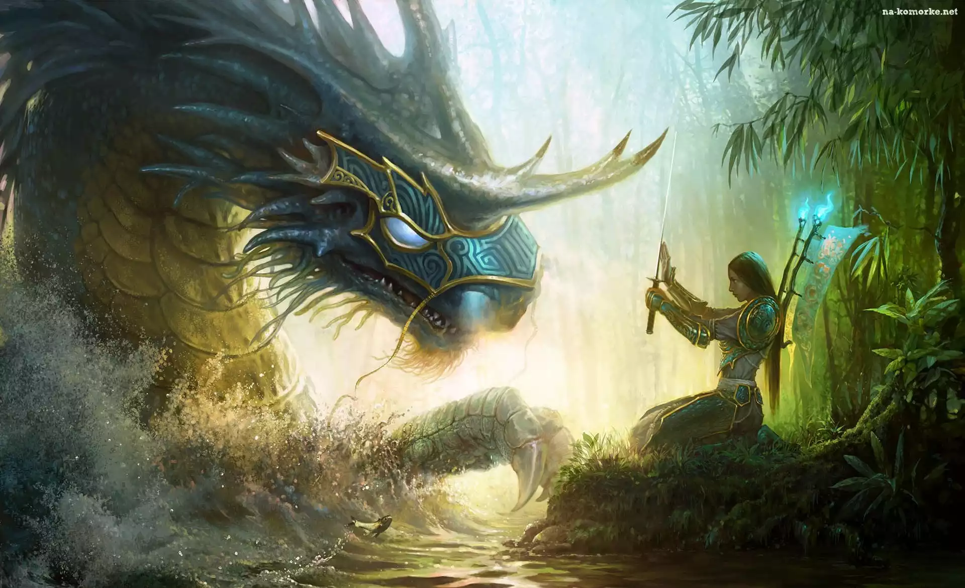 Las, Drzewo, Dziewczynka Mirumoto Kei, Strażniczka Lodowa, Planeta Kobieta, Ptak, Zieleń Kobieta, Chmury, Czarna, Suknia Piękna, Dziewczyna, Kwiaty Kobieta, Skrzydła, Płatki Czerwony, Feniks Anioły, Kosa, Miecze Księżniczka, Elfów, Ptak Surion, Mag, Wiatru Ogień, Lód Kobieta, Góry, Most Leśny, Elf