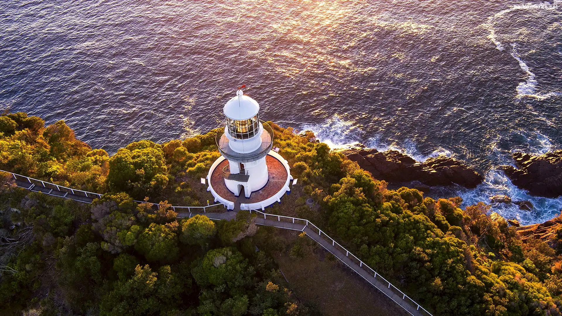 Morze, Sugarloaf Point Lighthouse, Latarnia morska, Australia, Drzewa, Z lotu ptaka na Komórkę