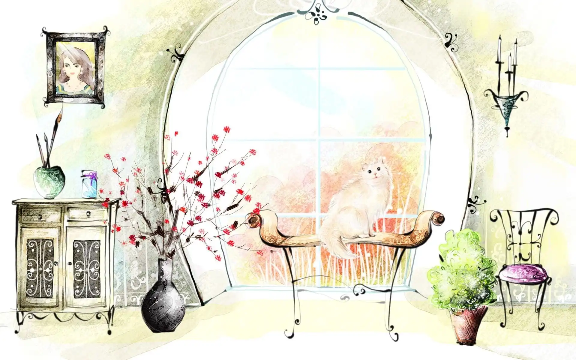 Pokój, Grafika, Kwiaty, Kot na Komórkę