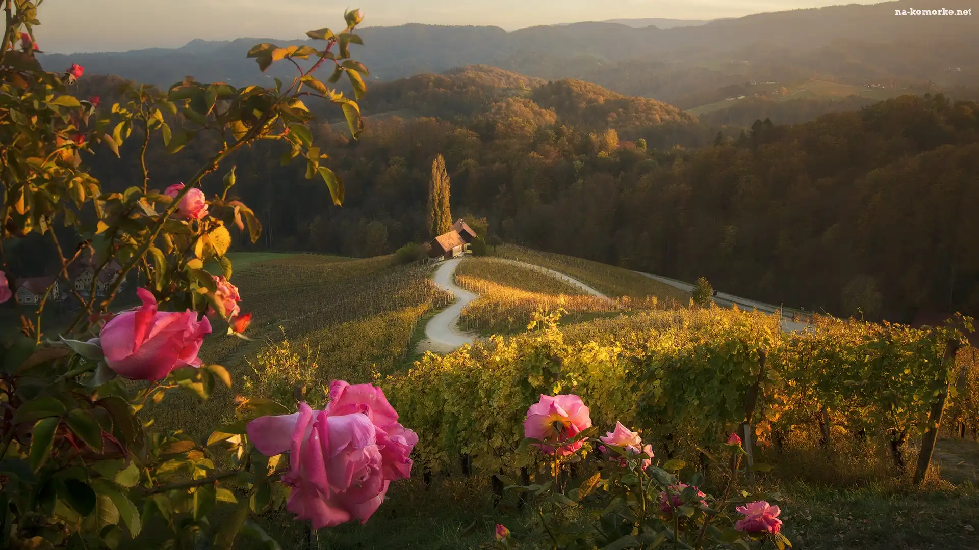 Pola, Wzgórza, Góry, Róże, Droga, Dom na Komórkę