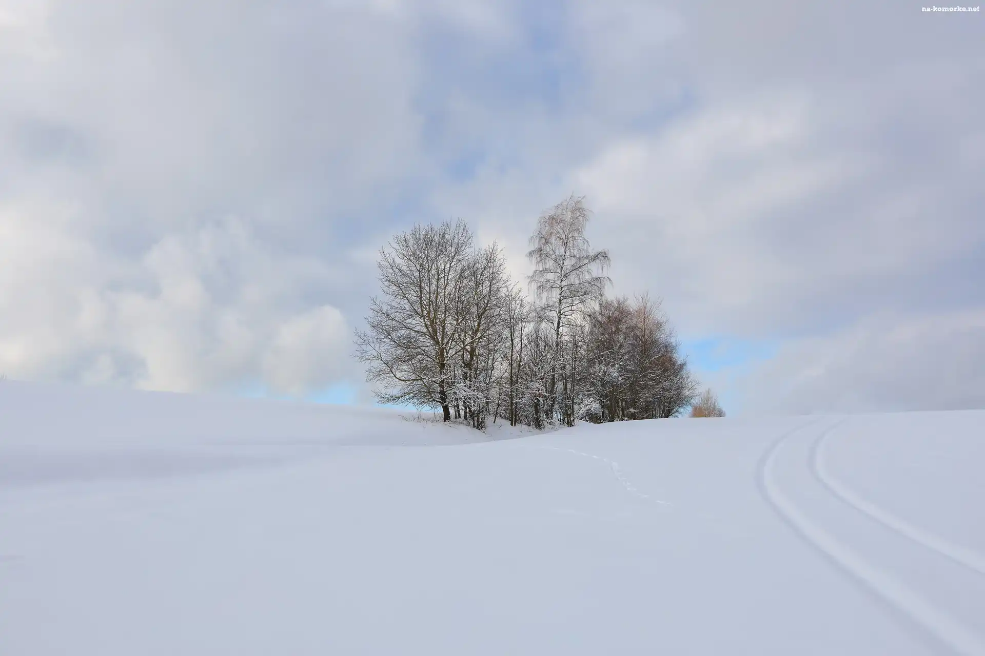 Pola, Zima, Ośnieżone, Drzewa, Ślady na Komórkę