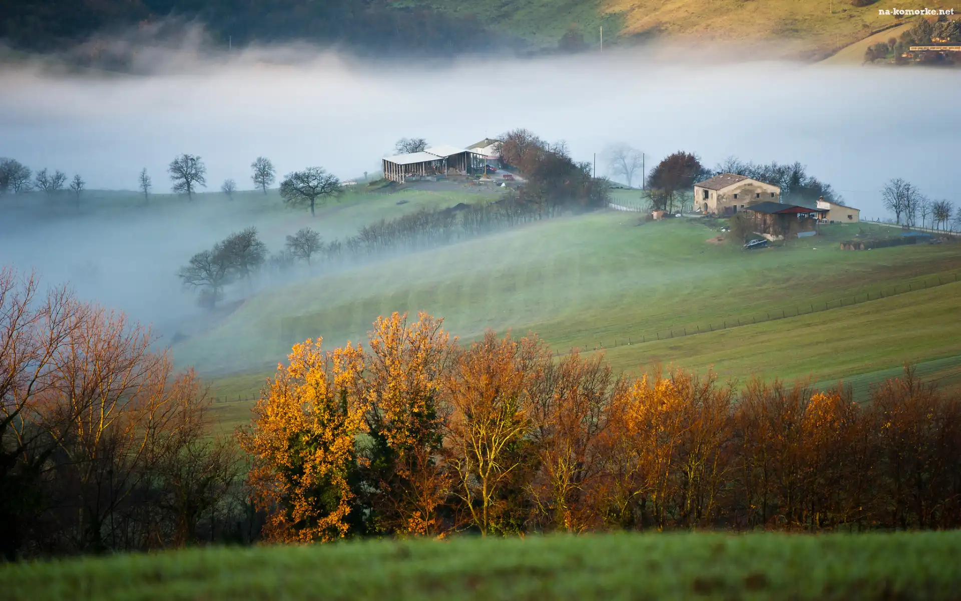 Pola, Góry, Drzewa, Poranek, Mgła, Domy na Komórkę