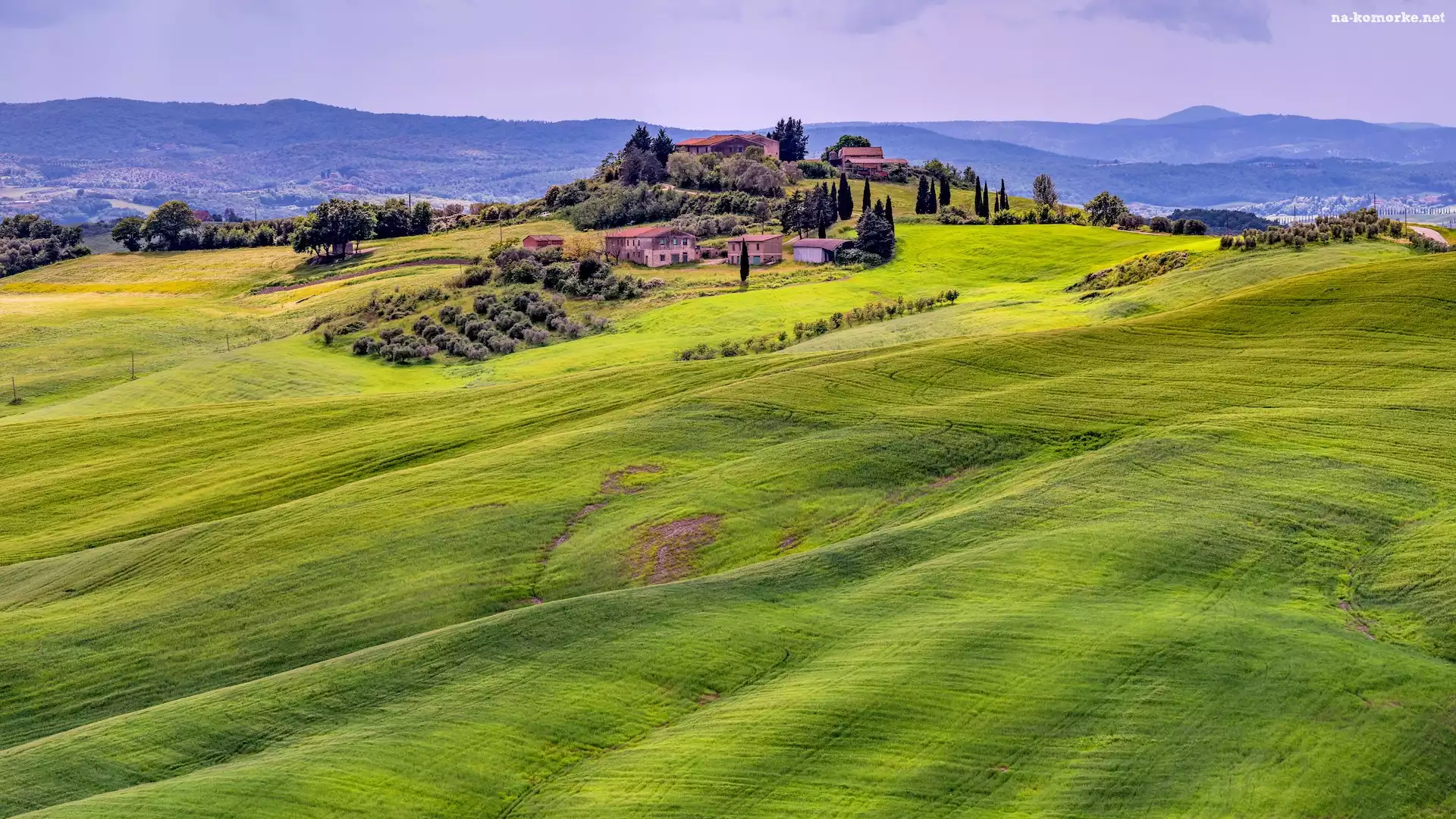 Drzewa, Włochy, Domy, Pola, Wzgórze, Toskania na Komórkę