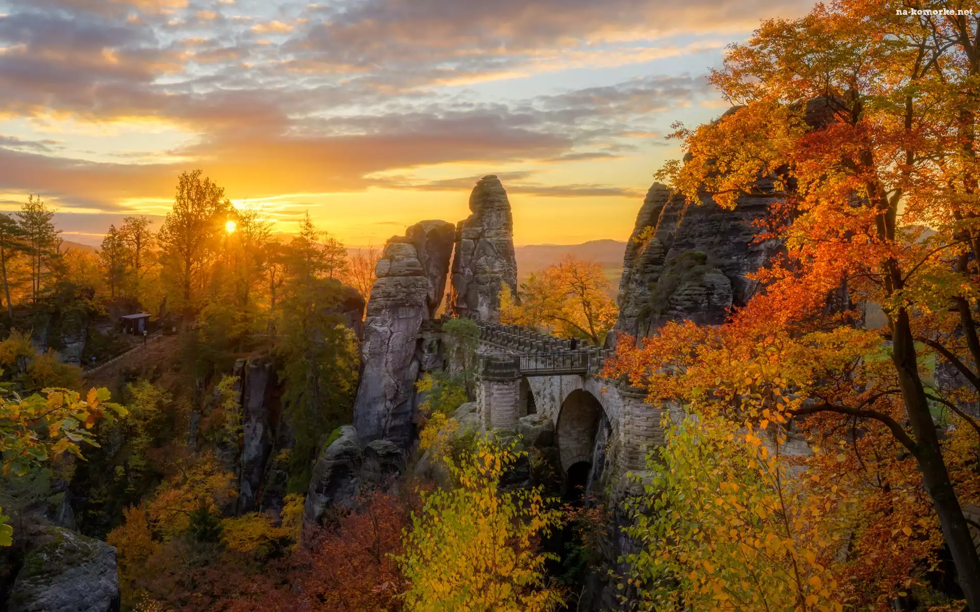 Jesień, Park Narodowy Saskiej Szwajcarii, Góry Połabskie, Las, Skały, Saksonia, Niemcy, Drzewa, Zachód słońca, Chmury, Bastei na Komórkę |