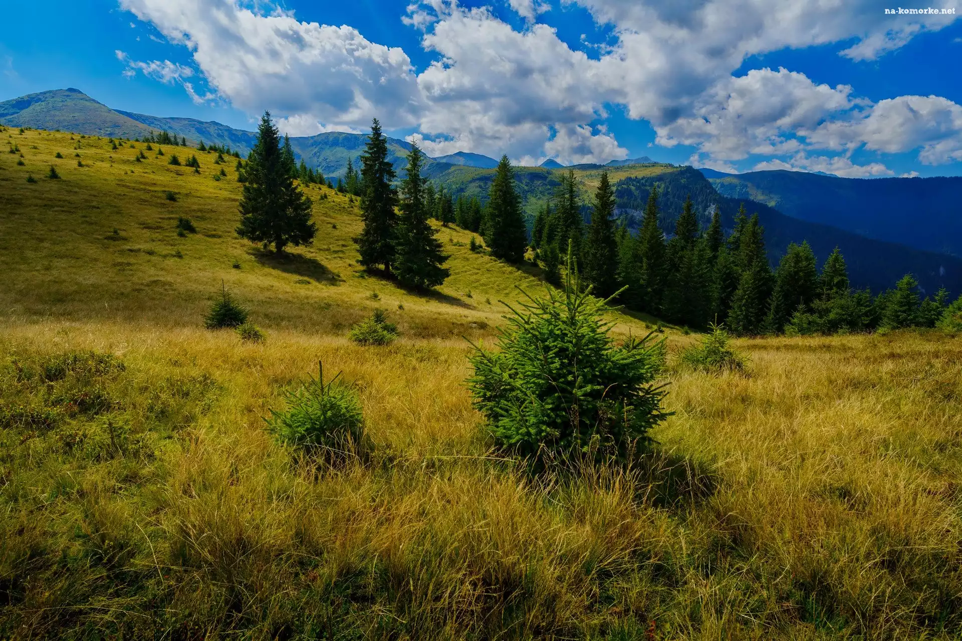 Góry, Polana, Trawa, Drzewa, Chmury na Komórkę