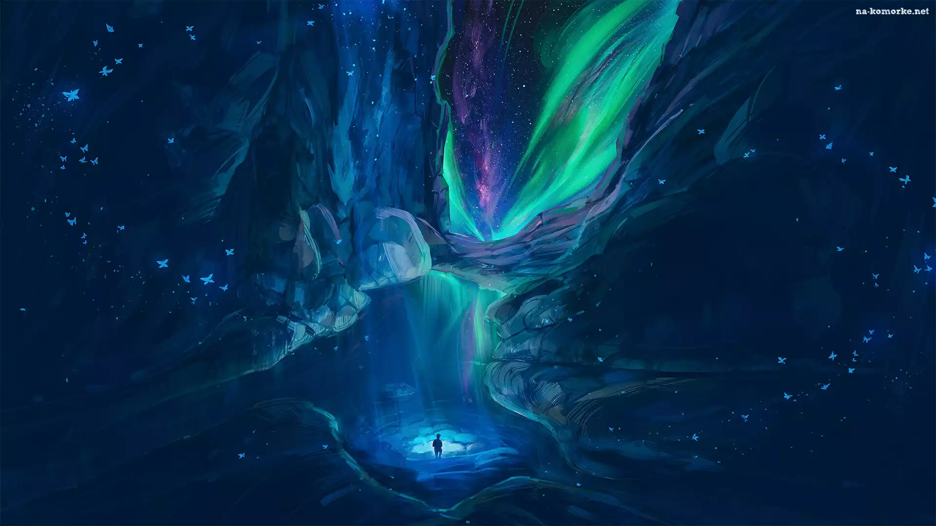 Zorza polarna, Człowiek, Grafika, Jaskinia na Komórkę