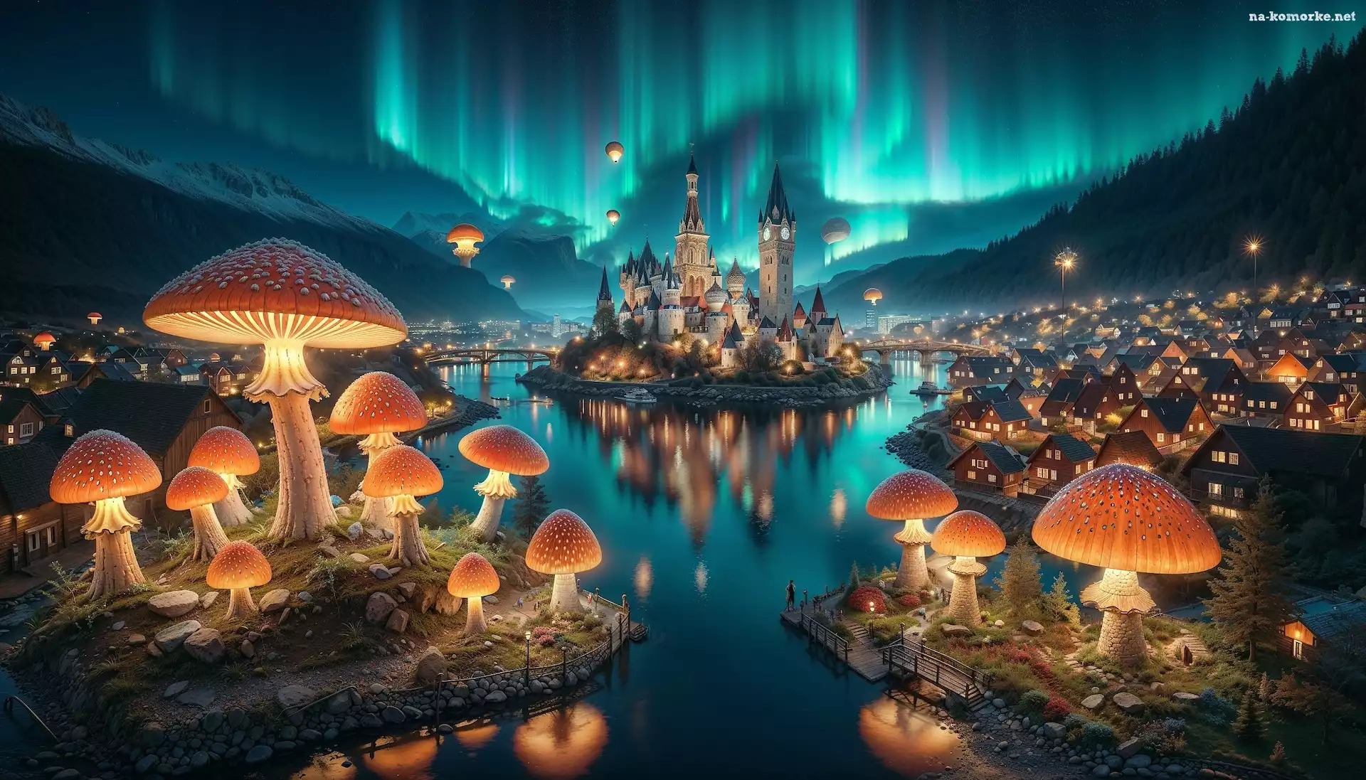 Grzyby, Fantasy, Zorza polarna, Podświetlone, Zamek, Jezioro na Komórkę