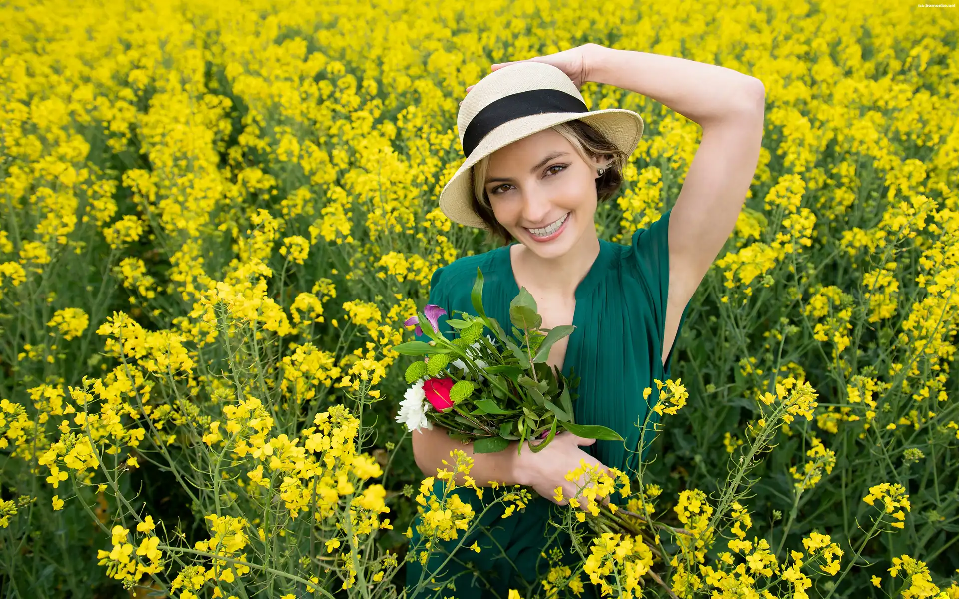 Uśmiechnięta, Pole, Kapelusz, Rzepak, Kobieta, Zielona, Sukienka, Bukiet na Komórkę