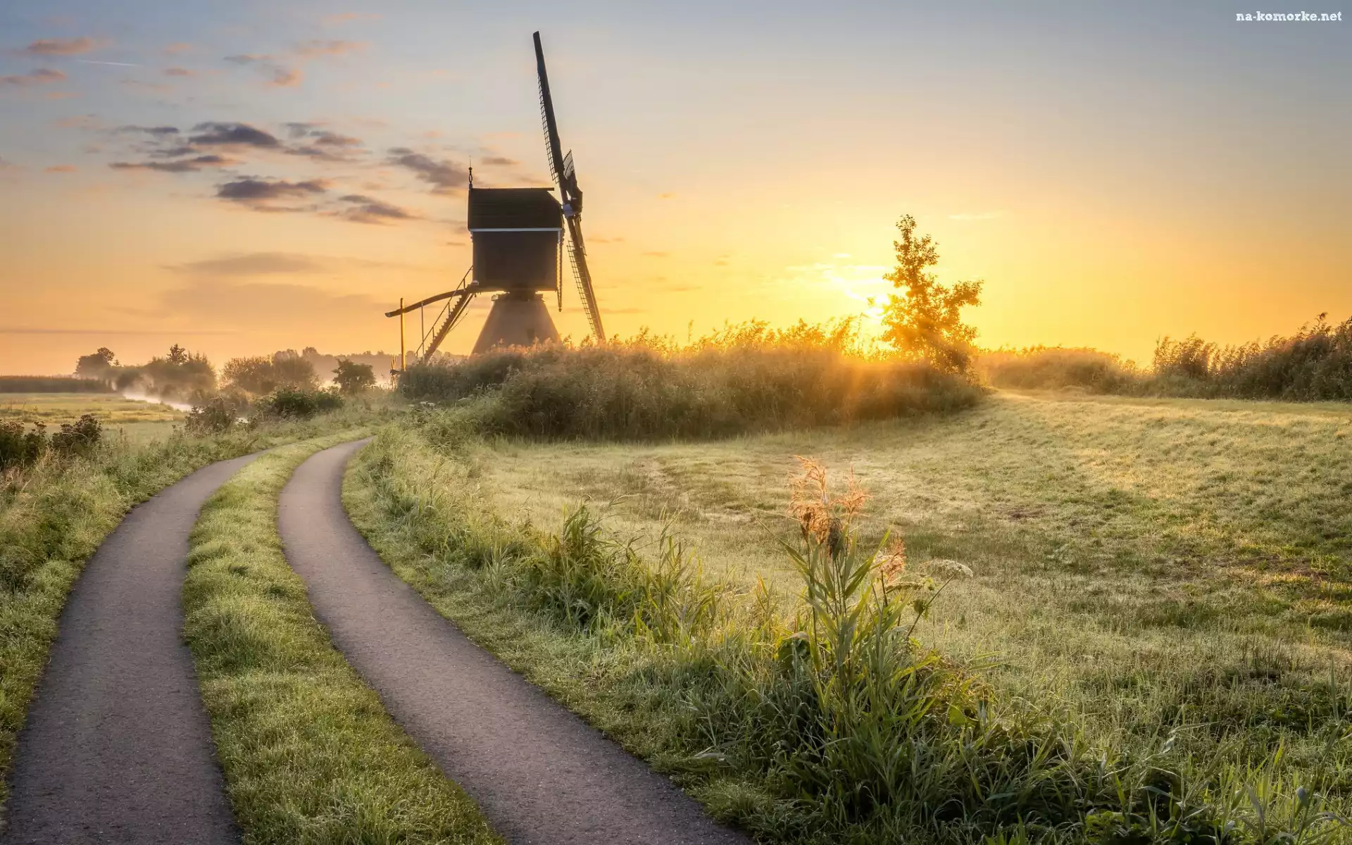 Droga, Pole, Wiatrak, Wschód słońca, Łąka, Mgła na Komórkę