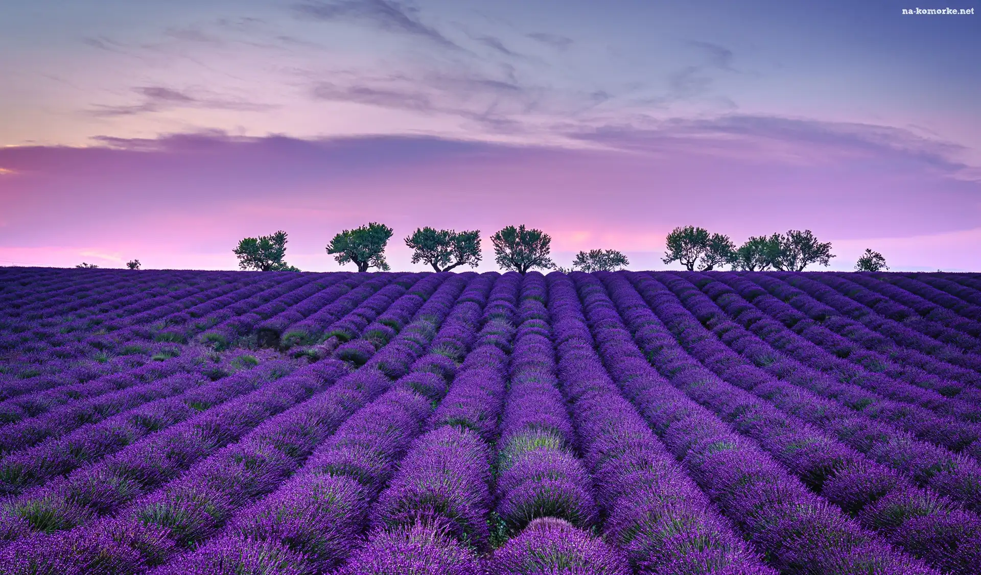 Pole, Wschód słońca, Lawenda, Drzewa na Komórkę