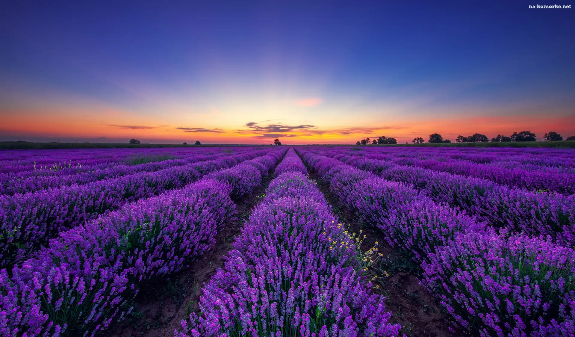 Pole, Zachód słońca, Lawenda, Drzewa na Komórkę