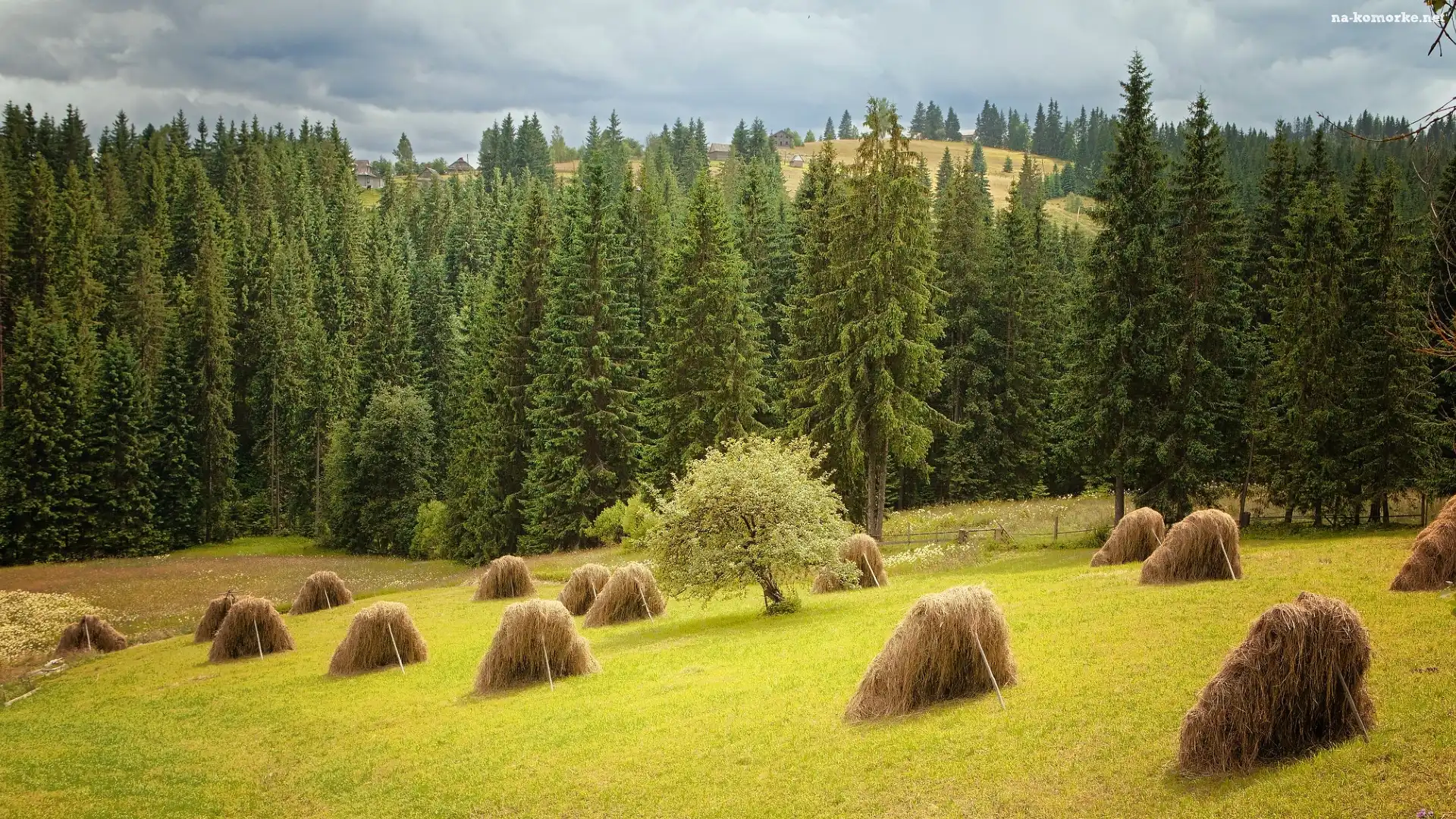 Pole, Drzewa, Las, Ostwie, Polana, Siano na Komórkę