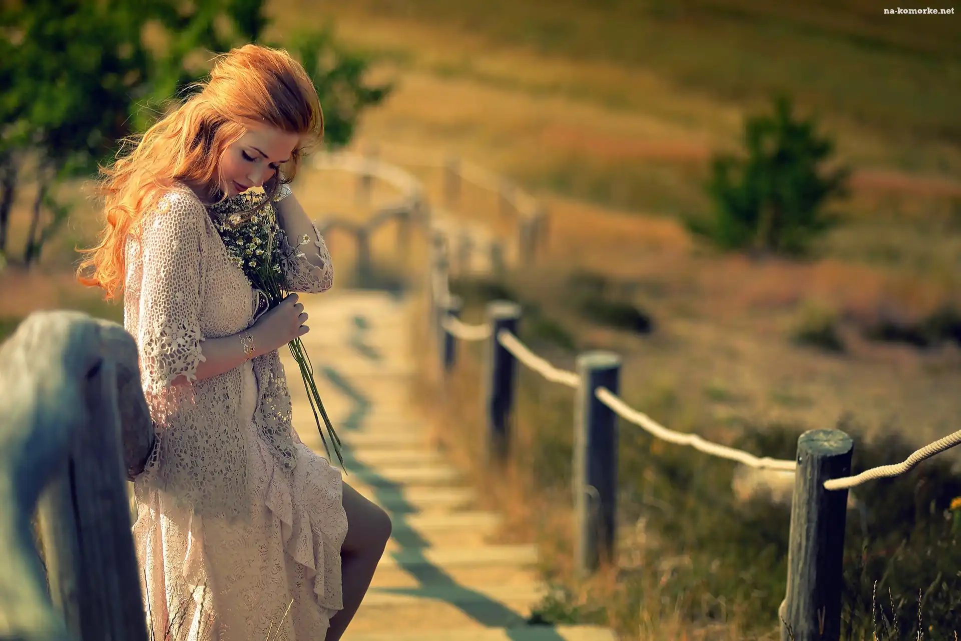 Romantyczna, Pole, Góra, Dziewczyna, Bukiecik, Rumianków, Schody na Komórkę