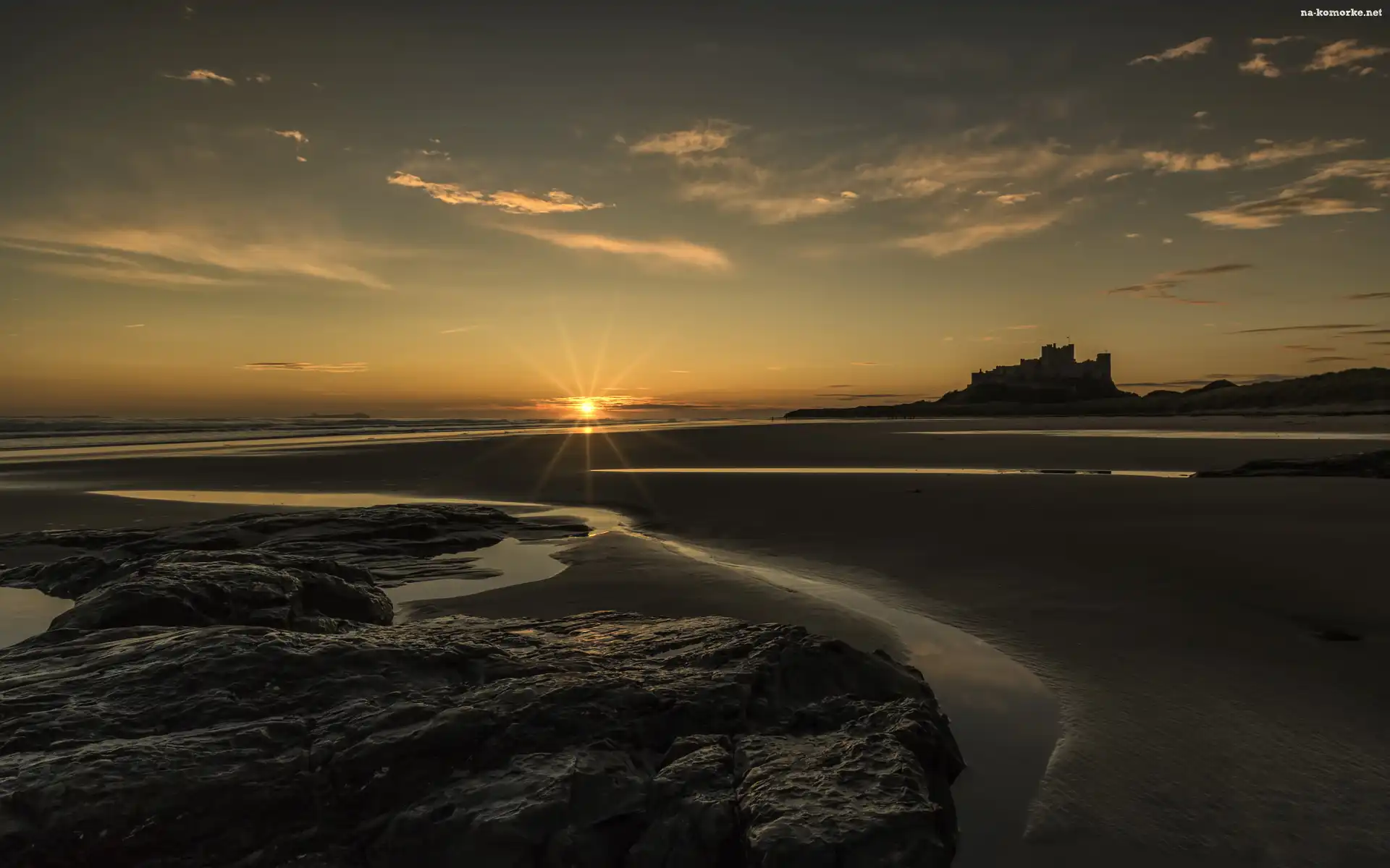 Morze Północne, Anglia, Zamek Bamburgh, Plaża, Zachód Słońca na Komórkę
