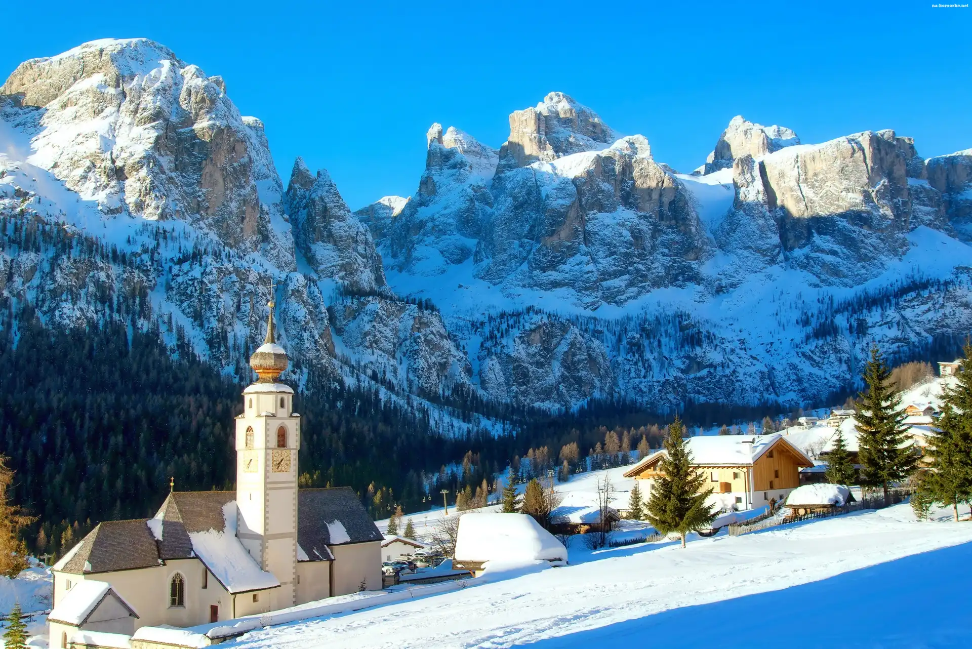 Góry, Północne, Domy, Włochy, Kościół, Ośrodek, Narciarski, Zima na Komórkę