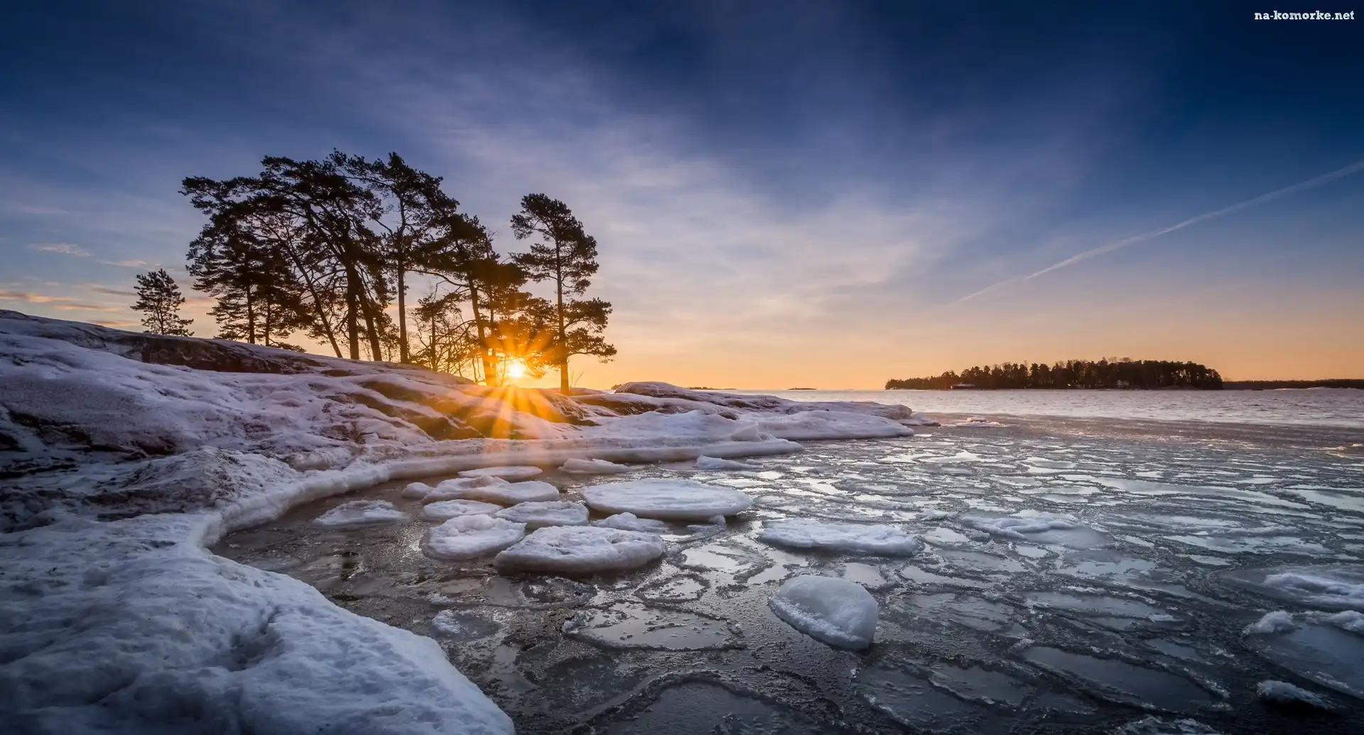 Finlandia, Plaża Kallahdenniemi, Drzewa, Półwysep Kallviksudden, Zachód słońca, Promienie słońca, Helsinki, Zatoka, Morze, Zima na Komórkę |