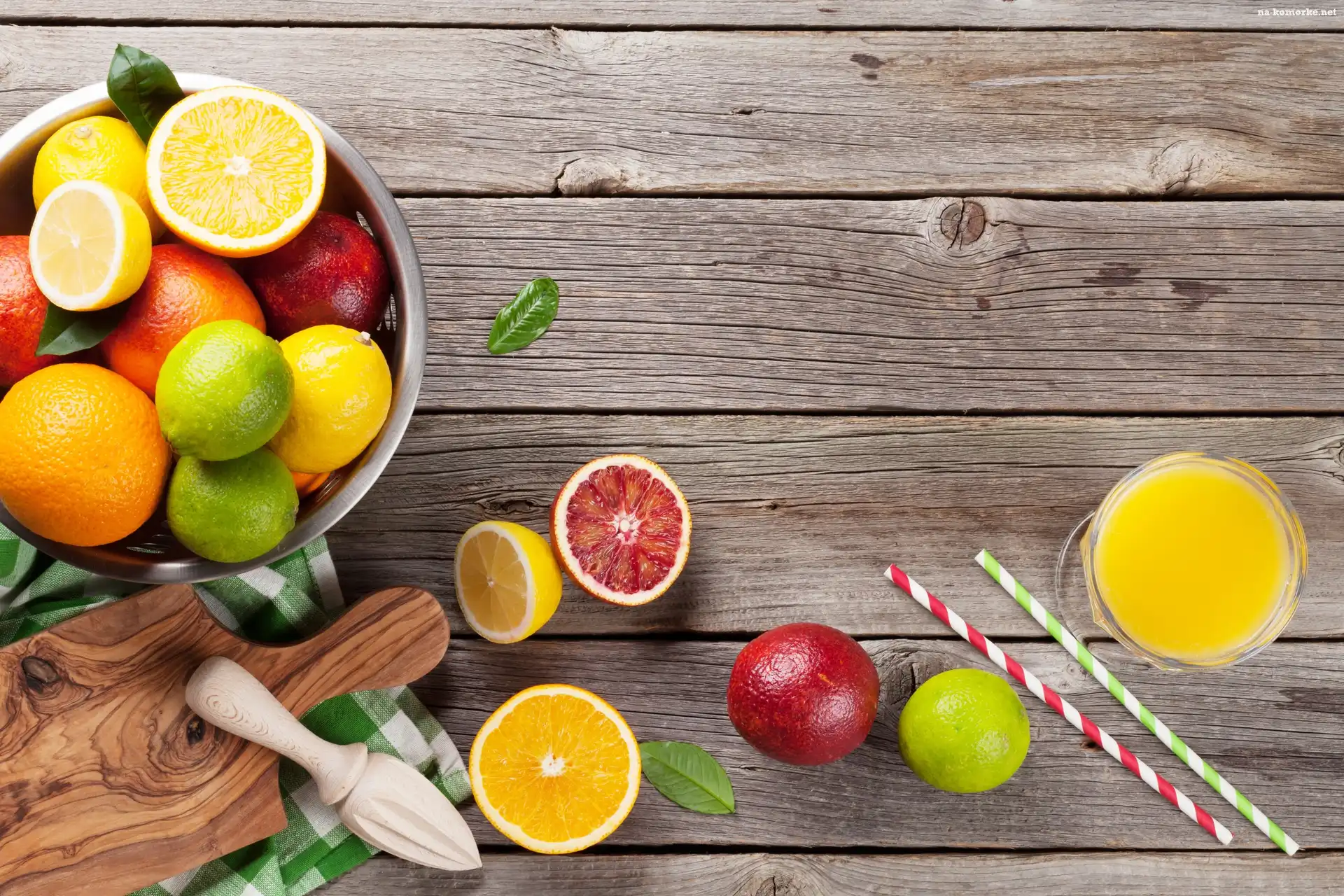 Pomarańcze, Kompozycja, Owoce, Szklanka, Limonki, Sok, Cytryny, Ściereczka, Deska, Cytrusy, Deski, Miska, Słomki na Komórkę |