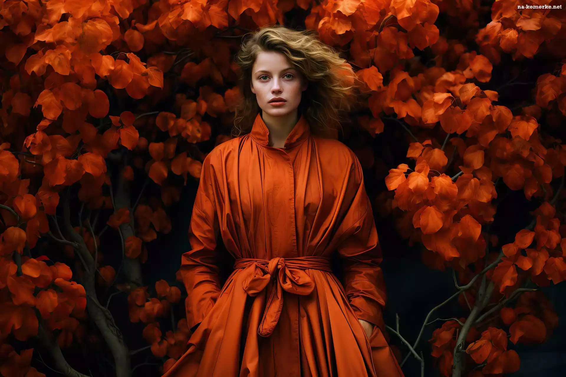 Płaszcz, Drzewa, Kobieta, Pomarańczowy na Komórkę
