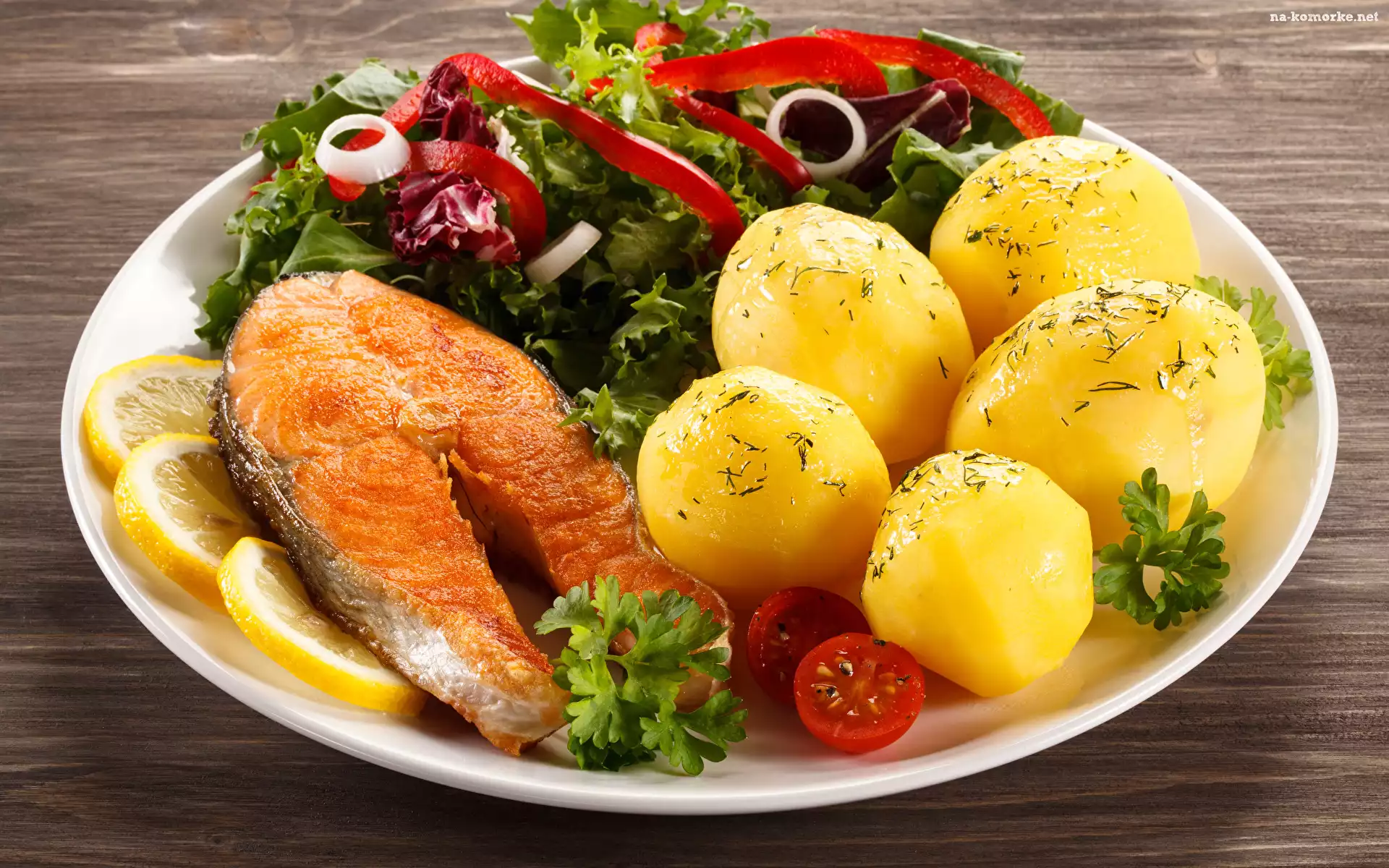Obiad, Pomidorki, Talerz, Ziemniaki, Ryba, Łosoś, Sałatka zielona na Komórkę