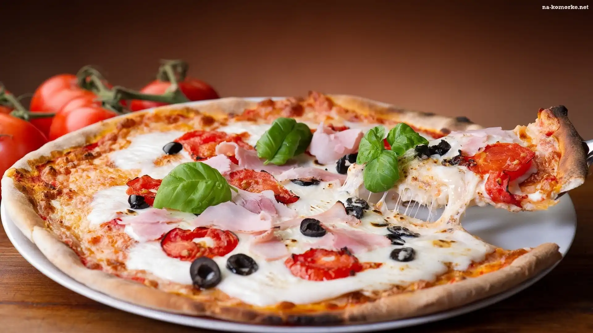 Pomidory, Szynka, Pizza, Ser, Oliwki, Bazylia na Komórkę