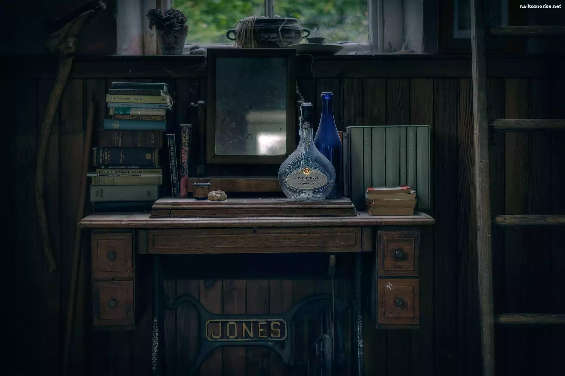 Książki, Pomieszczenie, Zaniedbane, Butelki, Maszyna do szycia, Lustro na Komórkę