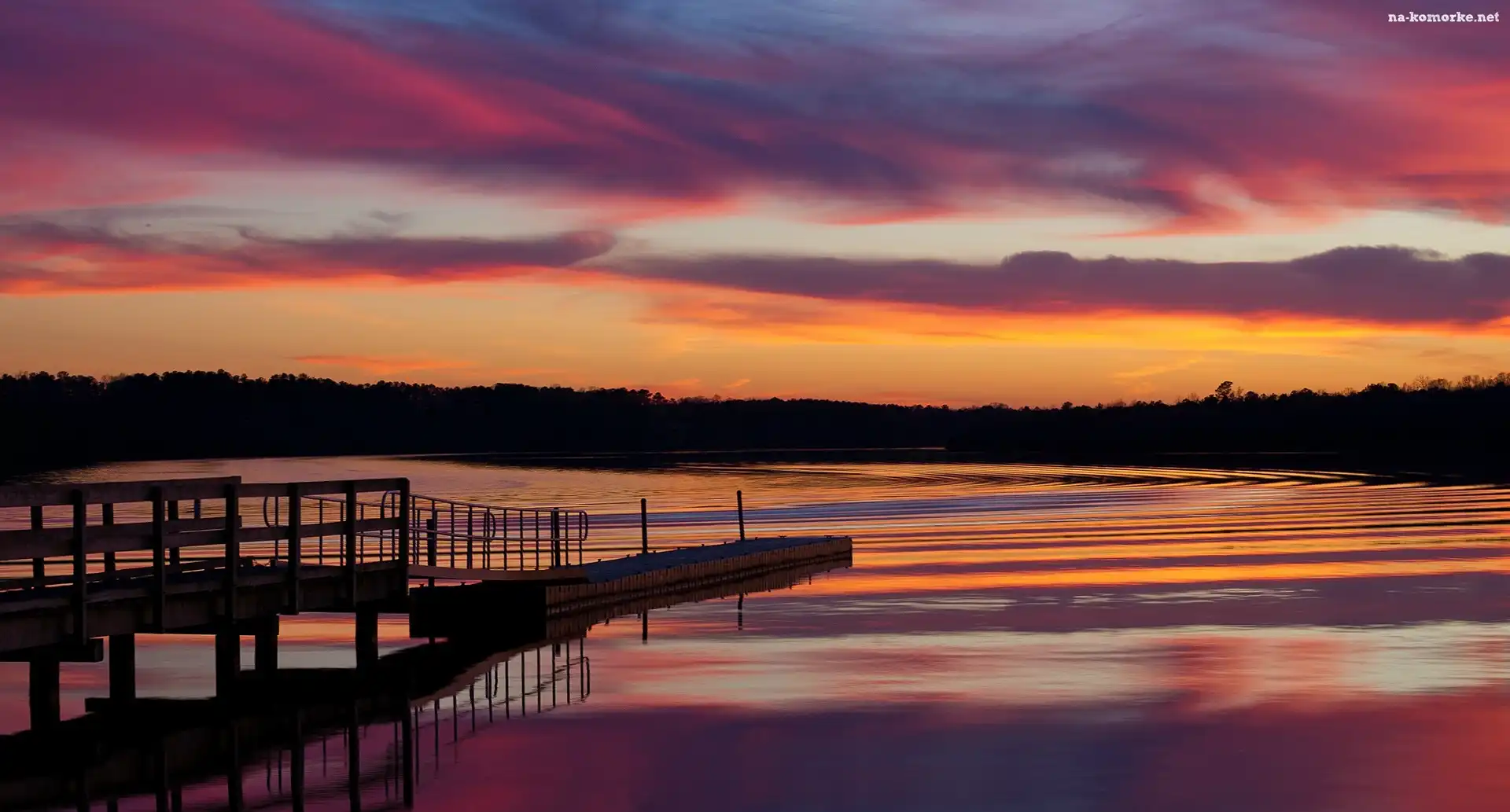 Pomost, Zachód, Słońca, Jezioro, Lasy na Komórkę