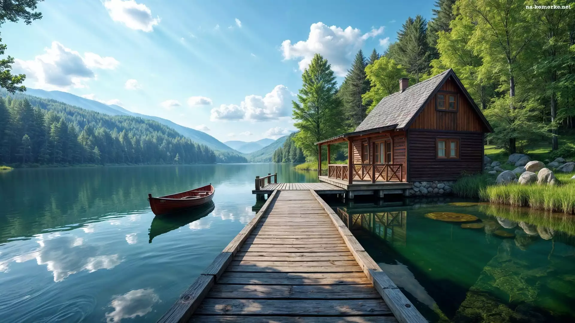 Jezioro, Pomost, Łódka, Dom, Góry na Komórkę