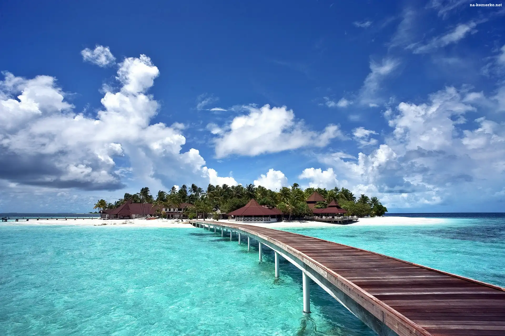 Morze, Pomost, Obłoki, Wysepka, Plaża, Domki, Palmy na Komórkę
