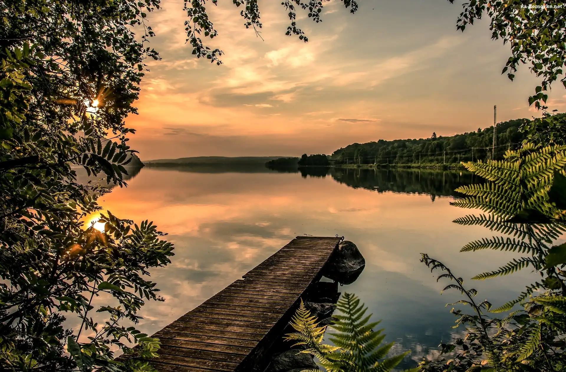 Pomost, Drzewa, Jezioro, Słońca, Roślinność, Wschód na Komórkę