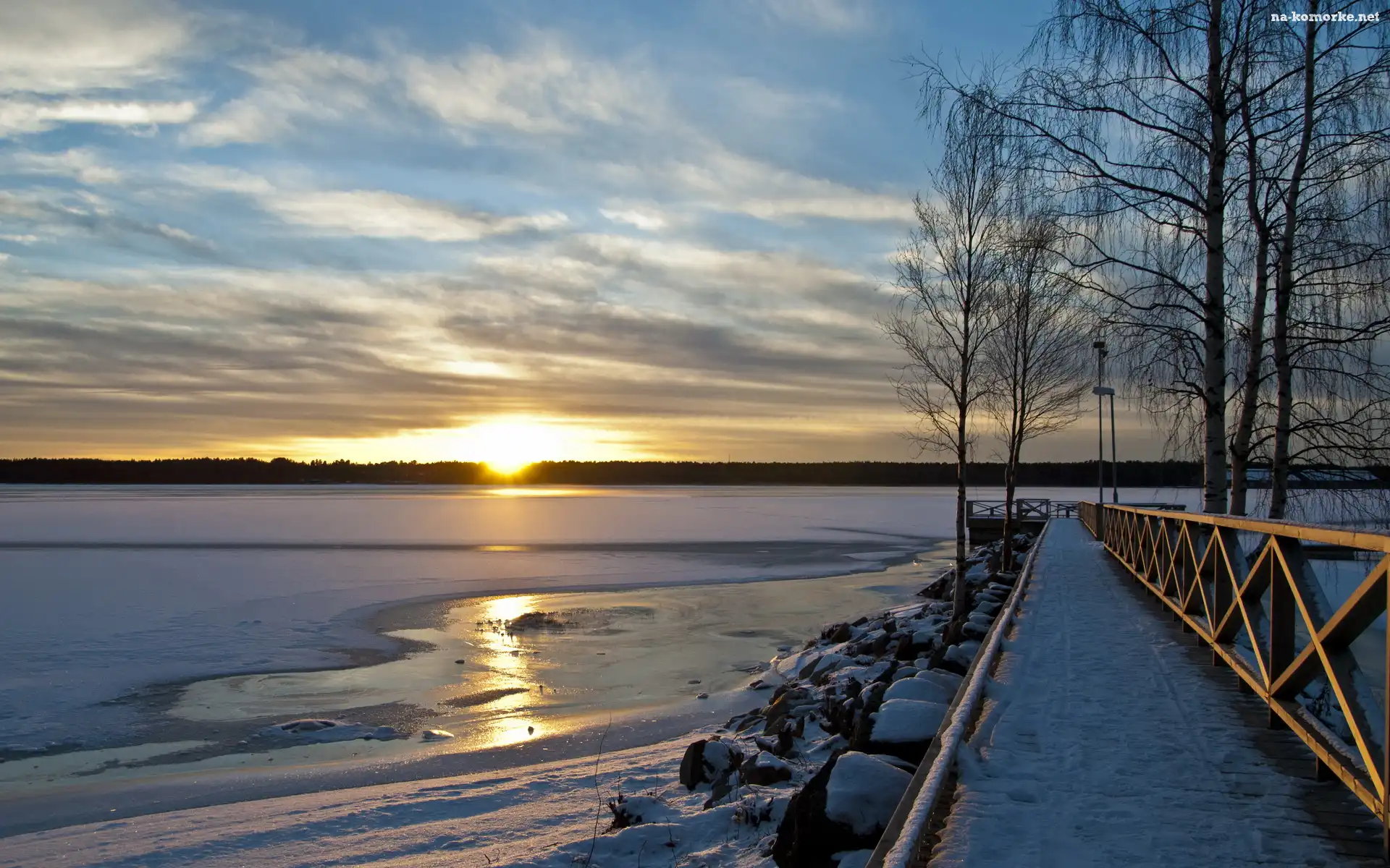 Pomost, Zachód, Słońca, Zamarznięte, Jezioro na Komórkę